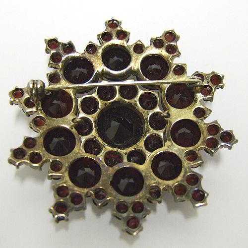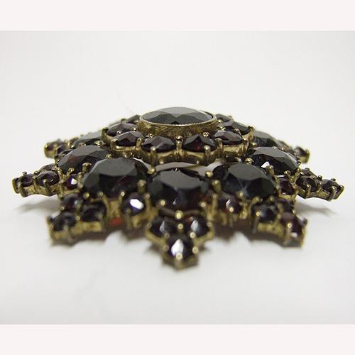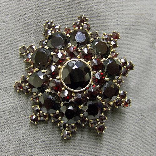 Bohemian garnet pin set with sixty one rose cut garnets of various sizes; pin measures 2" in diameter; setting is gold over silver; C. 1930 (no visible defects)