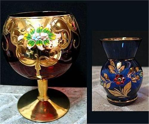 Bohemian ruby red glass snifter standing 7" tall, opening 3 3/4" across with enameling and gold accents. Original "Made in Italy" sticker. No chips or cracks, unsigned. With a 3 1/4" tall poesy vase