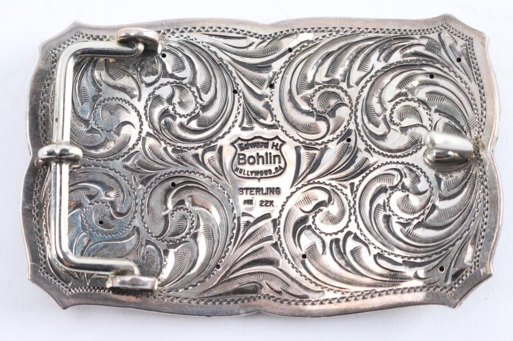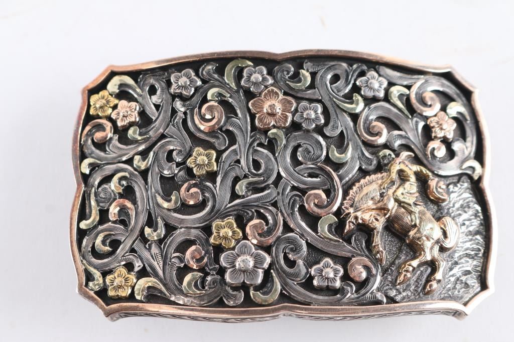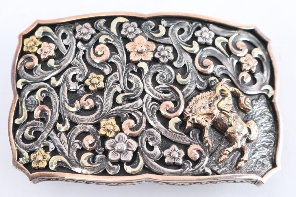 Sterling silver, 14kt yellow gold and 22kt rose gold. Scalloped shaped belt buckle with beautiful three tone floral and scrolling design and a yellow gold cowboy on bronc. Maker marked. Measures 3 1/2 x 2 1/2. From the Barry Erickson Collection.