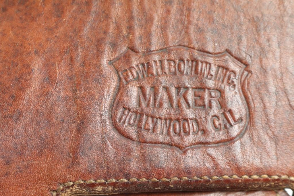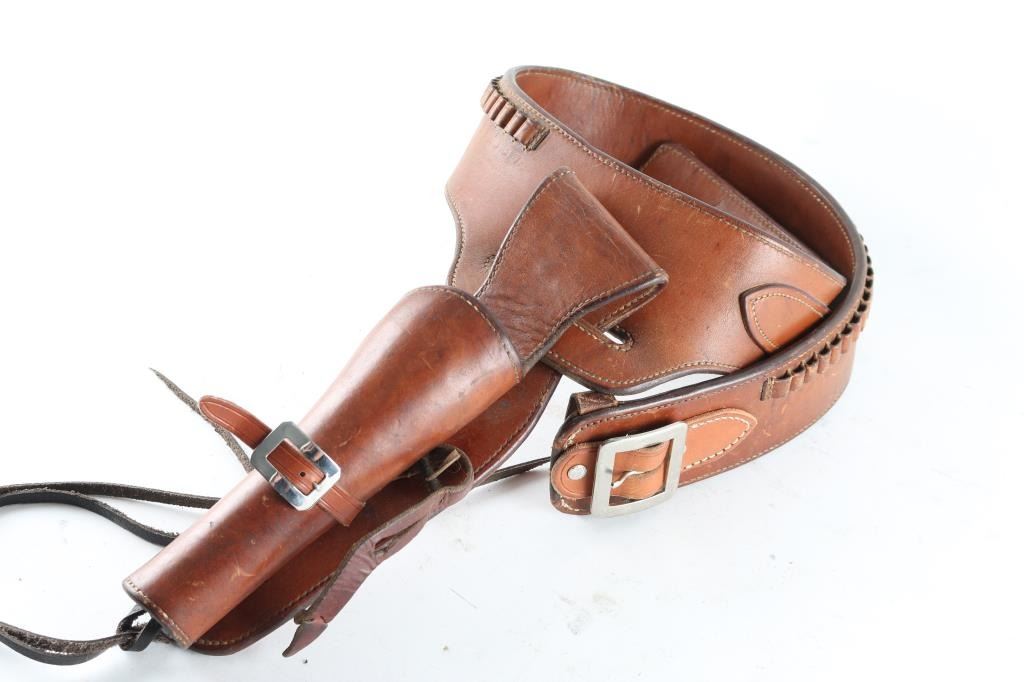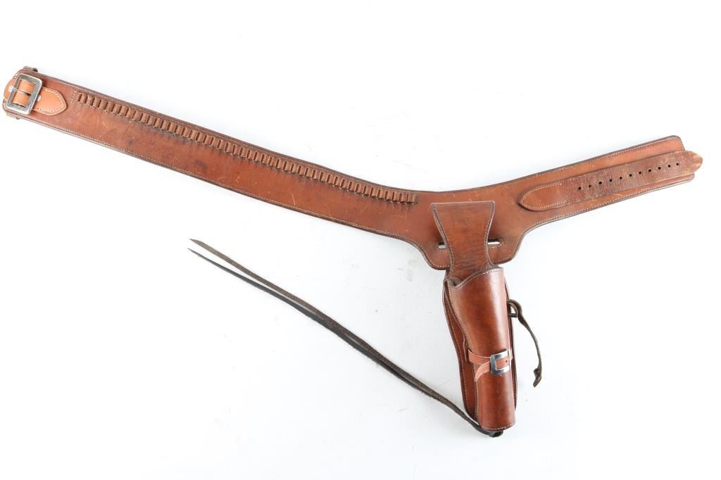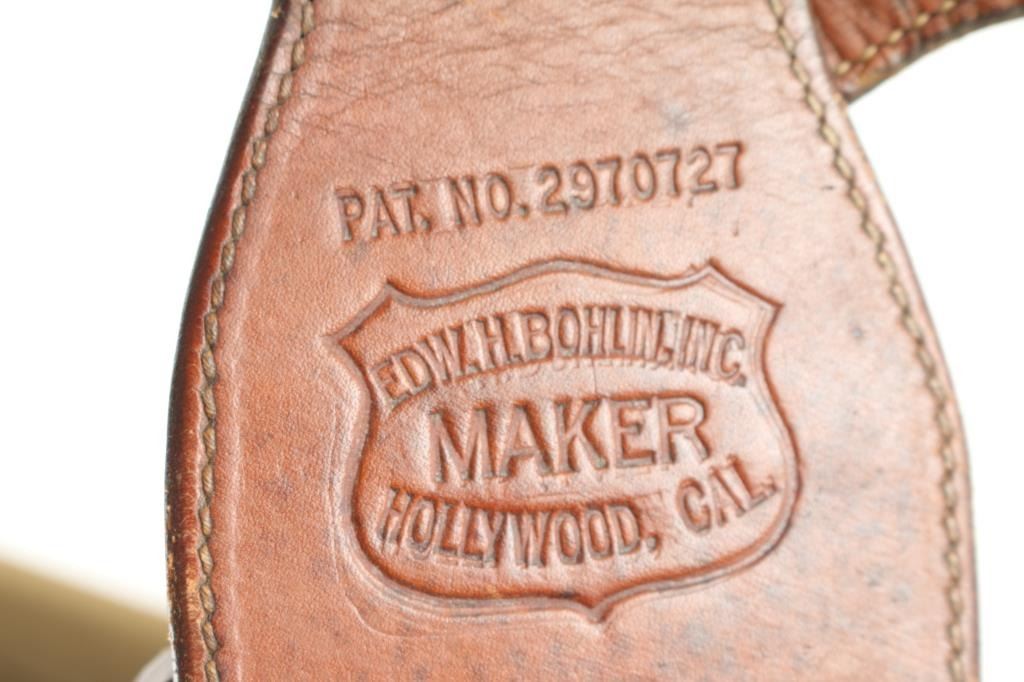 Smooth brown leather single rig, maker marked Edward Bohlin Hollywood CA. It has 22 cal loops. 42" from end to end.