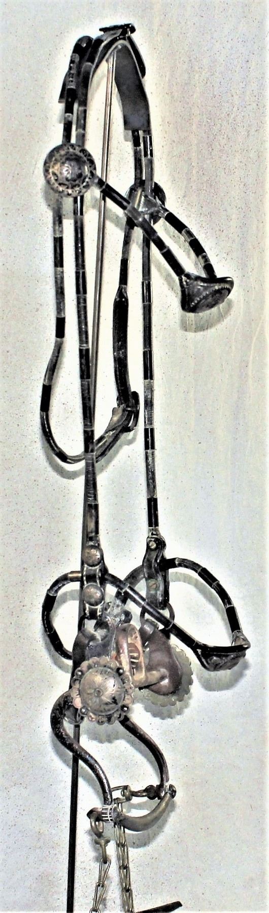 Spectacular silver ferruled bridle with terrific silver horsehead concho browband and noseband medallions, completed by and stunning maker marked "S" shank bit.