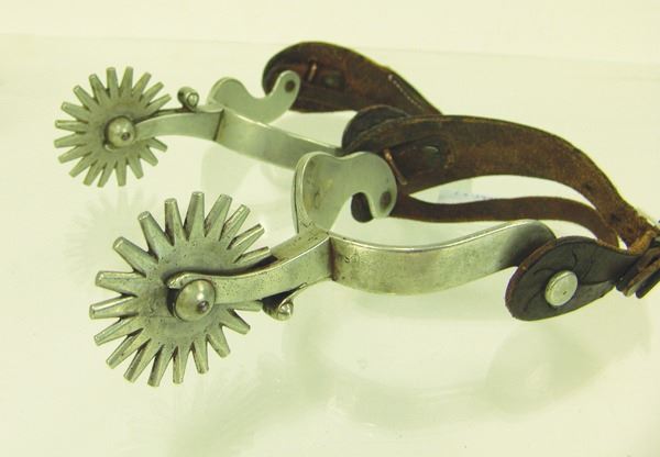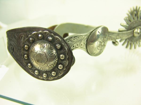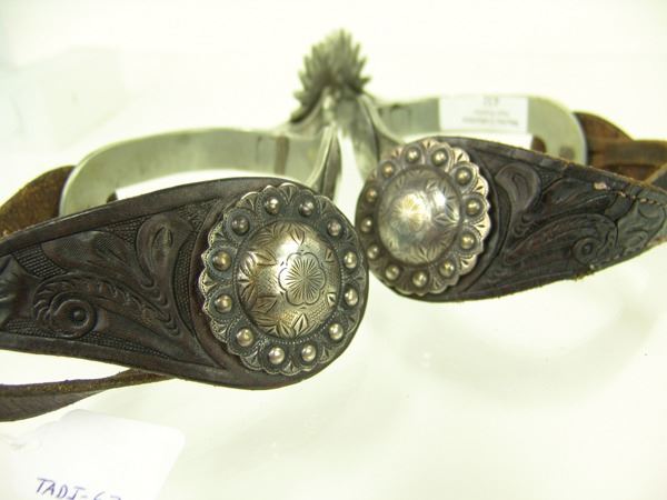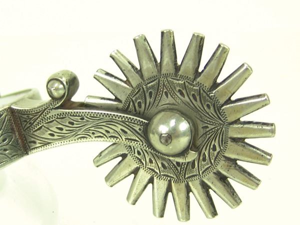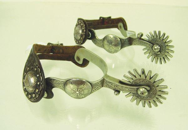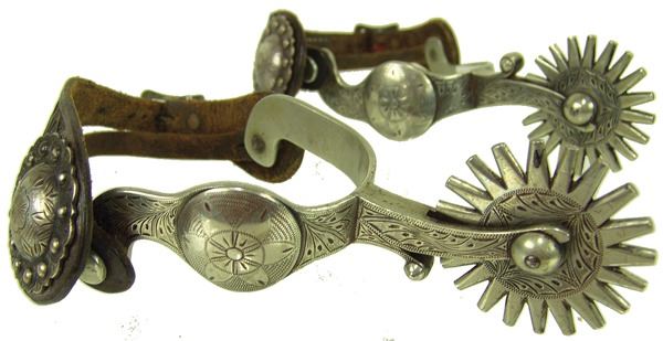 Fancy, vintage pair of single mounted parade spurs done in Bohlin and Fred Holm style with nickels, a 1-1/2" domed concho on side of heel band, engraved 2-5/8", 20 point rowels, and great old leathers with engraved, 2"Mid 1900sAdult