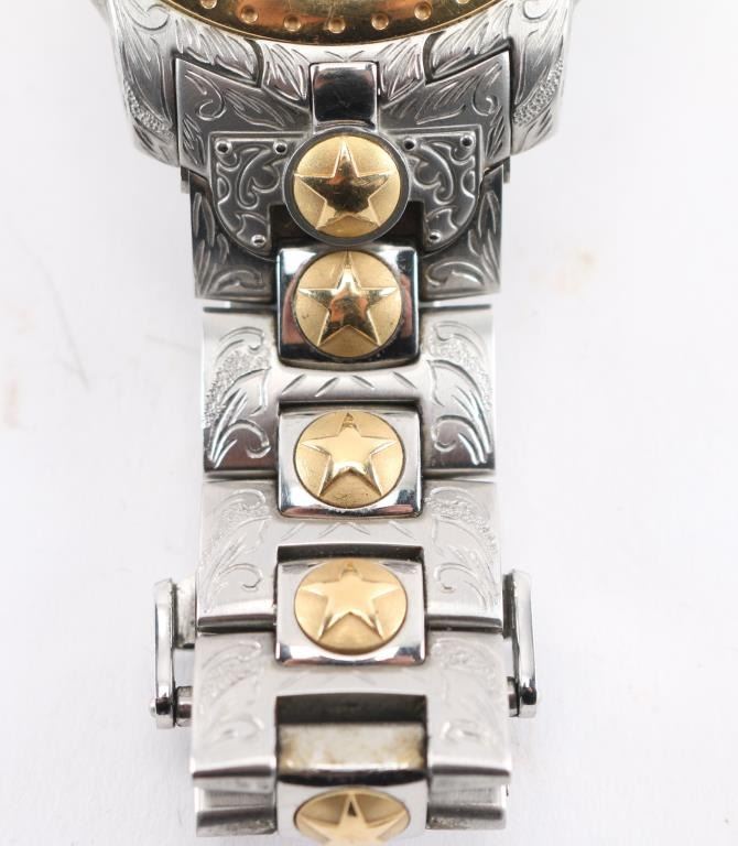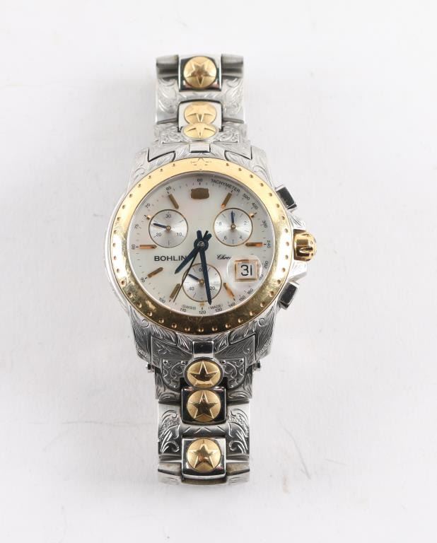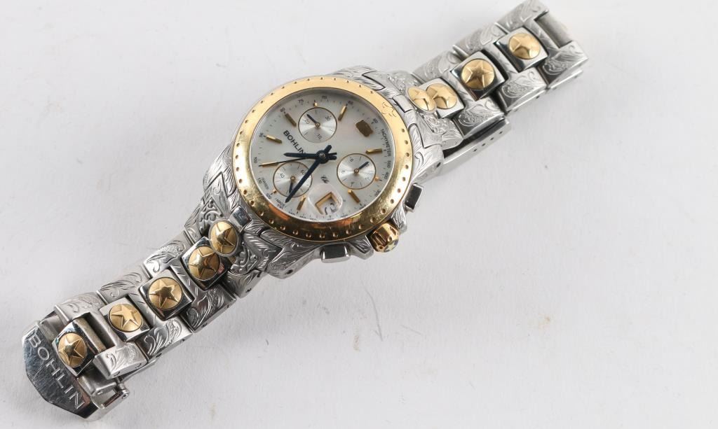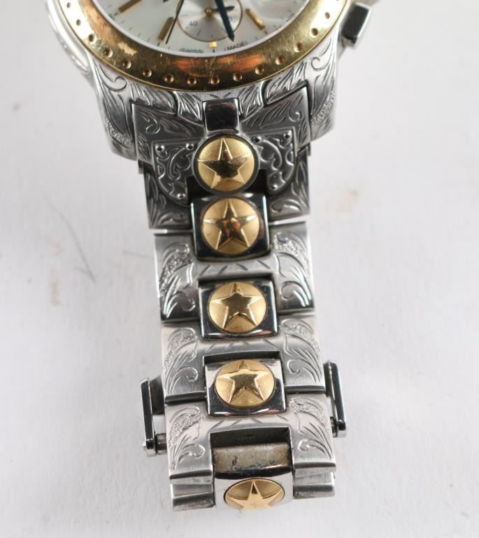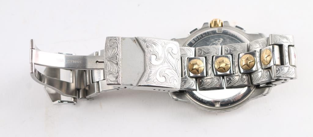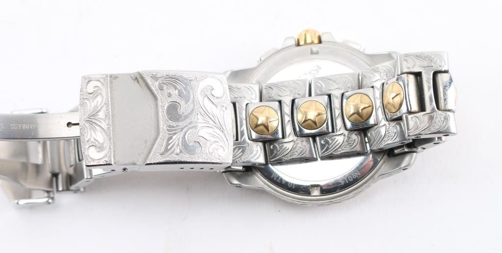 Two tone stainless and gold, number 14 and 10ATN marked. Swiss made white face with gold accents, tachometer chronograph wristwatch, accented with Texas stars. Bohlin Spirit of the West Stainless Steel & 18k Yellow Diamond Bezel engraved Engraved Stainless Steel & 18k Metal