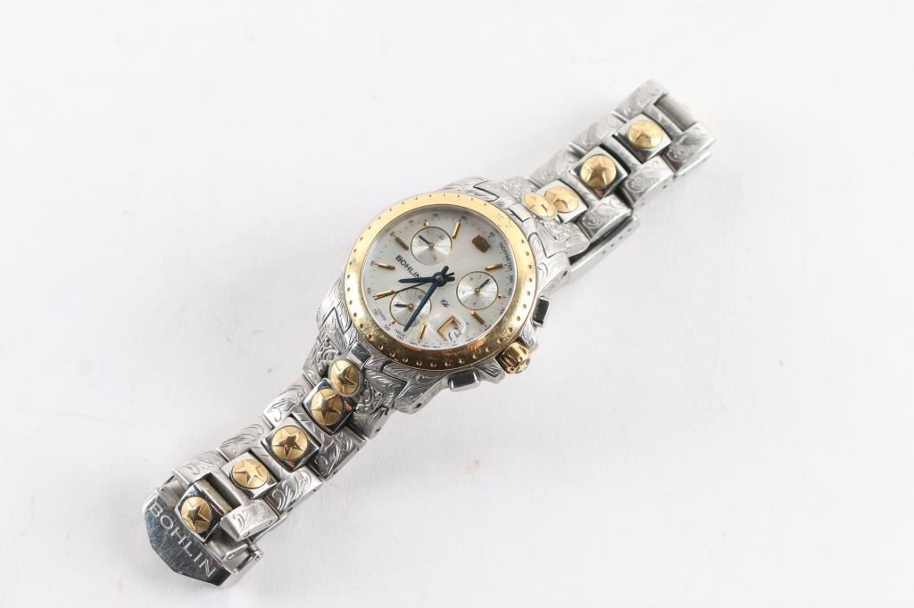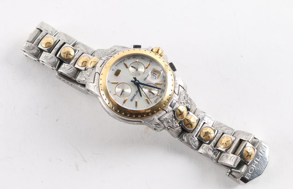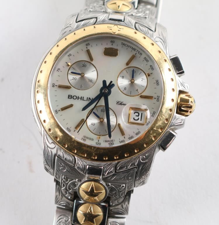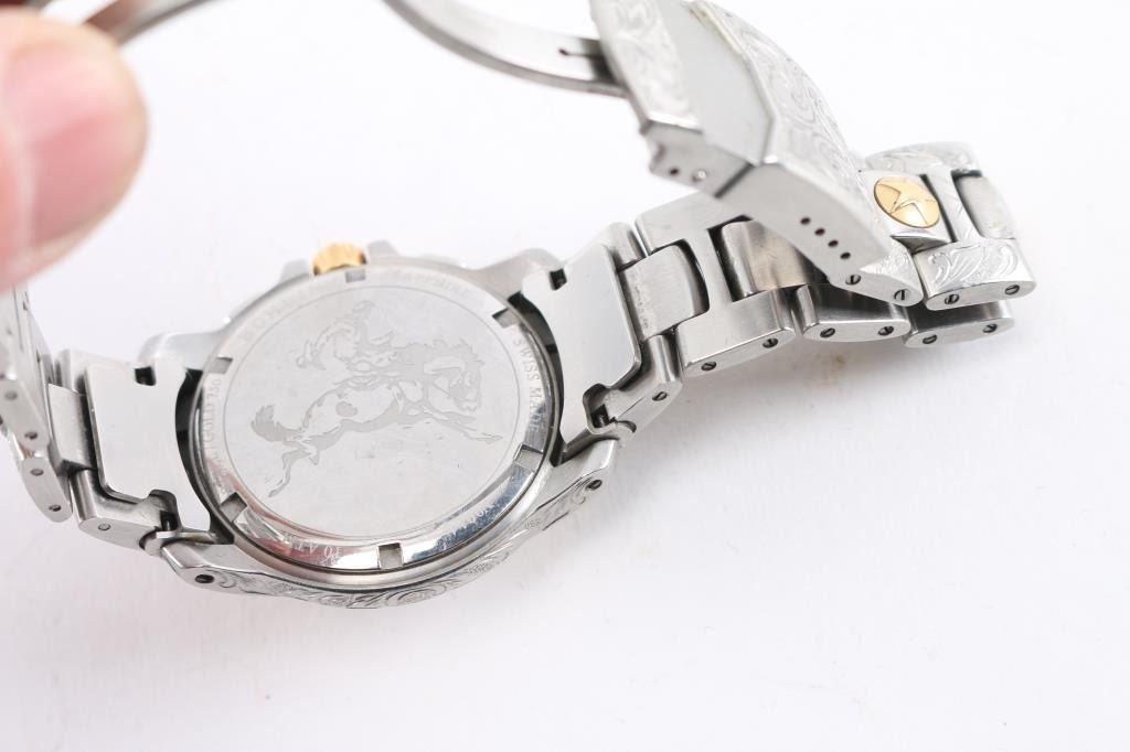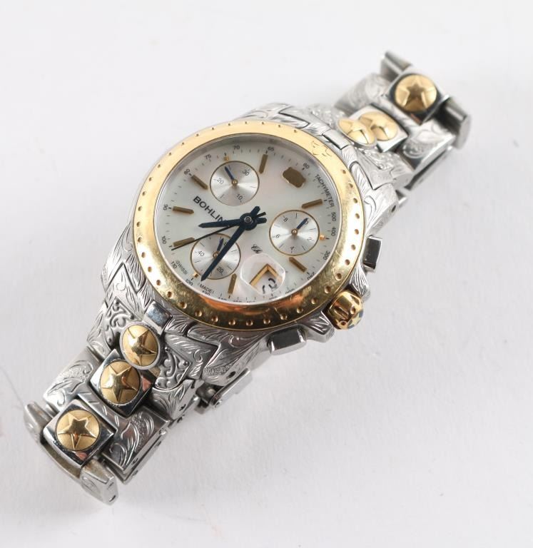 Two tone stainless and gold, number 14 and 10ATN marked. Swiss made white face with gold accents, tachometer chronograph wristwatch, accented with Texas stars. Bohlin Spirit of the West Stainless Steel & 18k Yellow Diamond Bezel engraved Engraved Stainless Steel & 18k Metal
