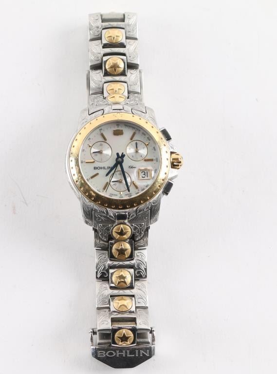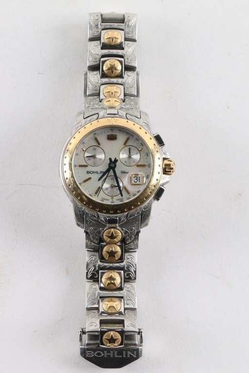 Water-resistant to 150ft , Crown on the Watch has a White Star on a Blue background like on the American flag, Case back is engraved with the Bohlin Seatplate. the signature of the company since it first appeared on the silver-mounted parade saddles that Bohlin began building in the 1930s. The Bohlin watch features a unique combination of the finest Swiss craftsmanship with the Spirit of the American West. Retail is 11,995. From the Barry Erickson Collection.