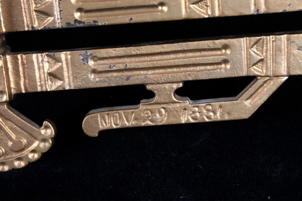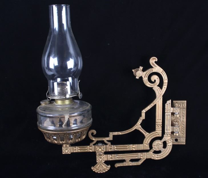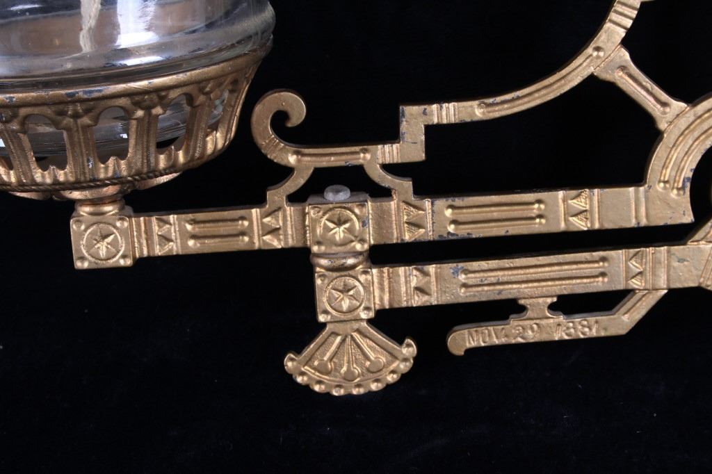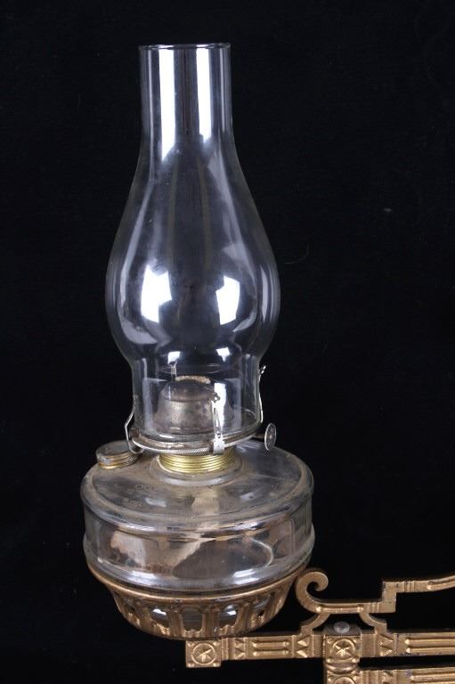 Featured in this lot is this Bohner 19th century cast iron kerosene lamp wall mount. The wall mount and kerosene lamp features a wonderfully and professionally crafted cast iron and glass construction. The wall mount shows a double swivel design that rotates in a 360 degrees and is made to mount to the wall and place the Whit Flame Light Co. kerosene lamp. The condition of this wall mount is fair with a break in the top portion of the wall mount bracket but otherwise in fair overall condition. The measurements of this wall mount are 14 7/8" x 5 3/8" x 11 1/2".
