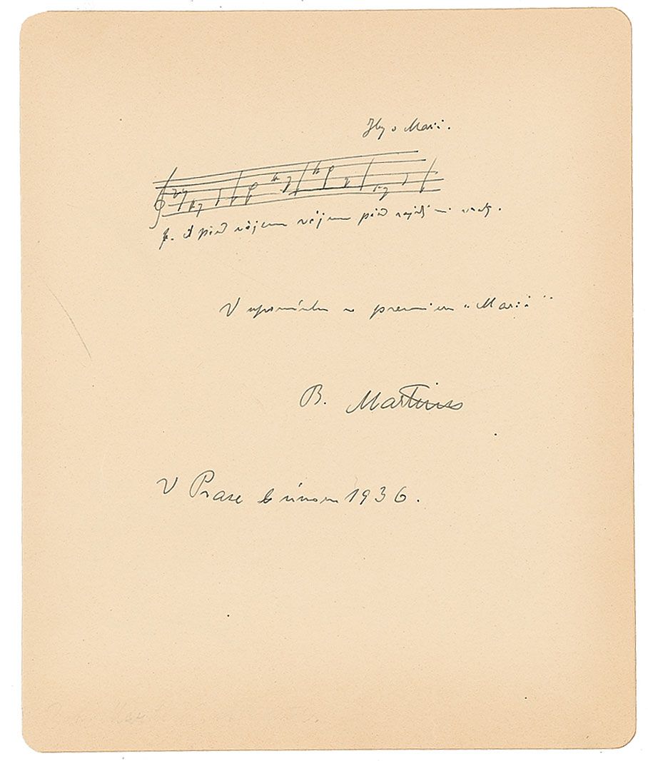 Prolific Bohemian-Czech composer (1890–1959) of modern classical music. AMQS on an off-white 6 x 7.25 sheet. Martinu pens four bars from his opera ‘Hry o Marii [The Miracles of Mary],’ signed below in Czech [translated], “In memory of the premiere of ‘Mary,’ B. Martinu, Prague, February 8, 1936.” In fine condition.