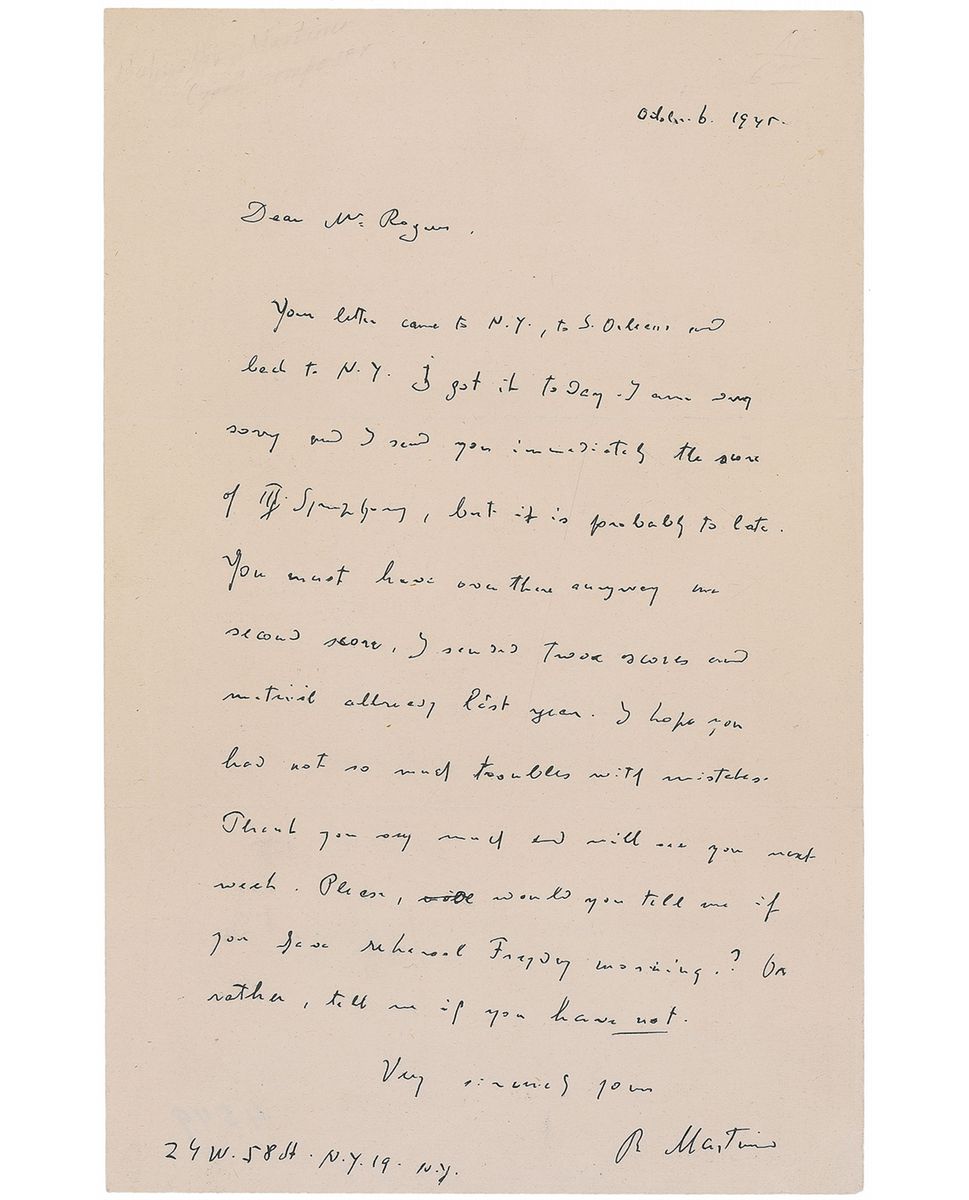 Prolific Bohemian-Czech composer (1890–1959) of modern classical music. ALS signed “B. Martinu,” one page, 5.75 x 9, October 6, 1945. Letter to “Mr. Rogers,” possibly American composer Bernard Rogers. In part (spelling and grammar retained): “I am very sorry and I send you immediately the score of III Symphony, but it is probably to late. You must have over there anyway me second score. I sended twoa scores and matirial allready last year. I hope you had not so much troubles with mistakes.” In fine condition.