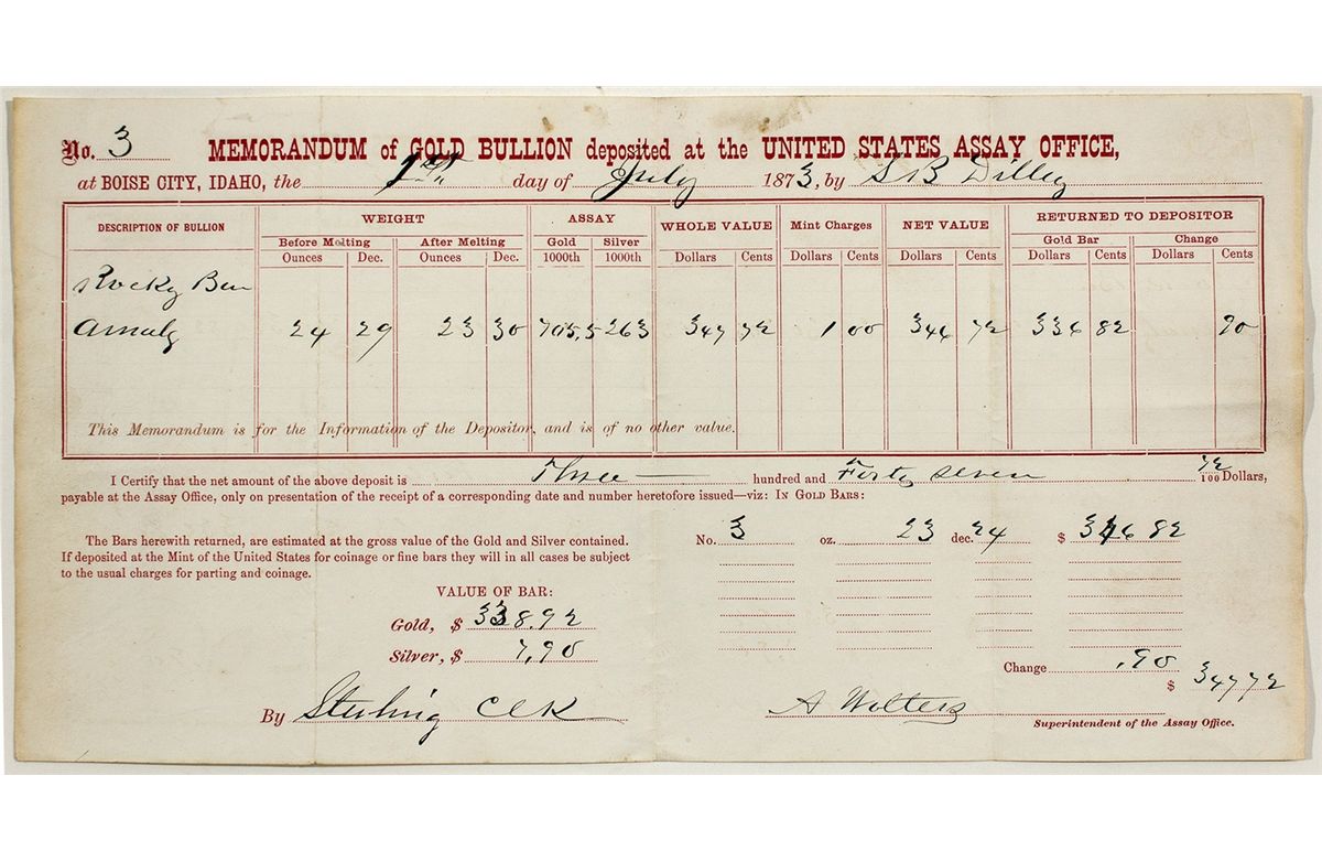 1873 This is a rare receipt for bullion from the United States Assay Office in Boise City, Idaho. It’s dated July 1, 1873. It’s in the amount of $347.72, comprising $338.92 in gold and $7.95, plus assay fee. It is signed by A. Walters, superintendent It has some age creasing, measures 11”x 6” and is in nice condition. Lynn Langdon Collection - HKA#65283