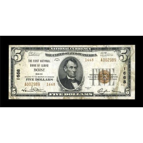 <B>Boise, ID</B></I> - $5 1929 Ty. 2 <B>The First NB of Idaho</B></I> Ch. # 1668<BR> This evenly circulated <B>Very Fine</B></I> $5 from the state capital was the first national bank to be chartered in the state. <BR><BR><b>Shipping:</b> Coins & Currency (<a target="_blank" href="http://www.heritageauctions.com/common/shipping.php">view shipping information</a>)