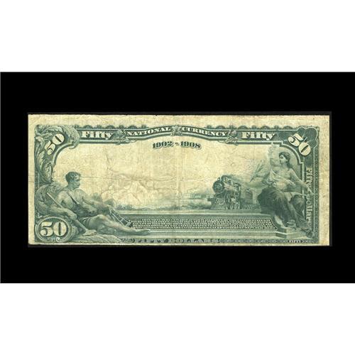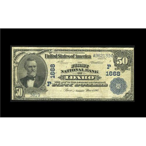 <B>Boise, ID</B></I> - $50 1902 Plain Back Fr. 677 <B>The First NB of Idaho</B></I> Ch. # 1668<BR>This bank only had high denomination notes printed during the Third Charter period. This <B>Very Good-Fine</B></I> example has a couple of minor edge splits along the top edge.