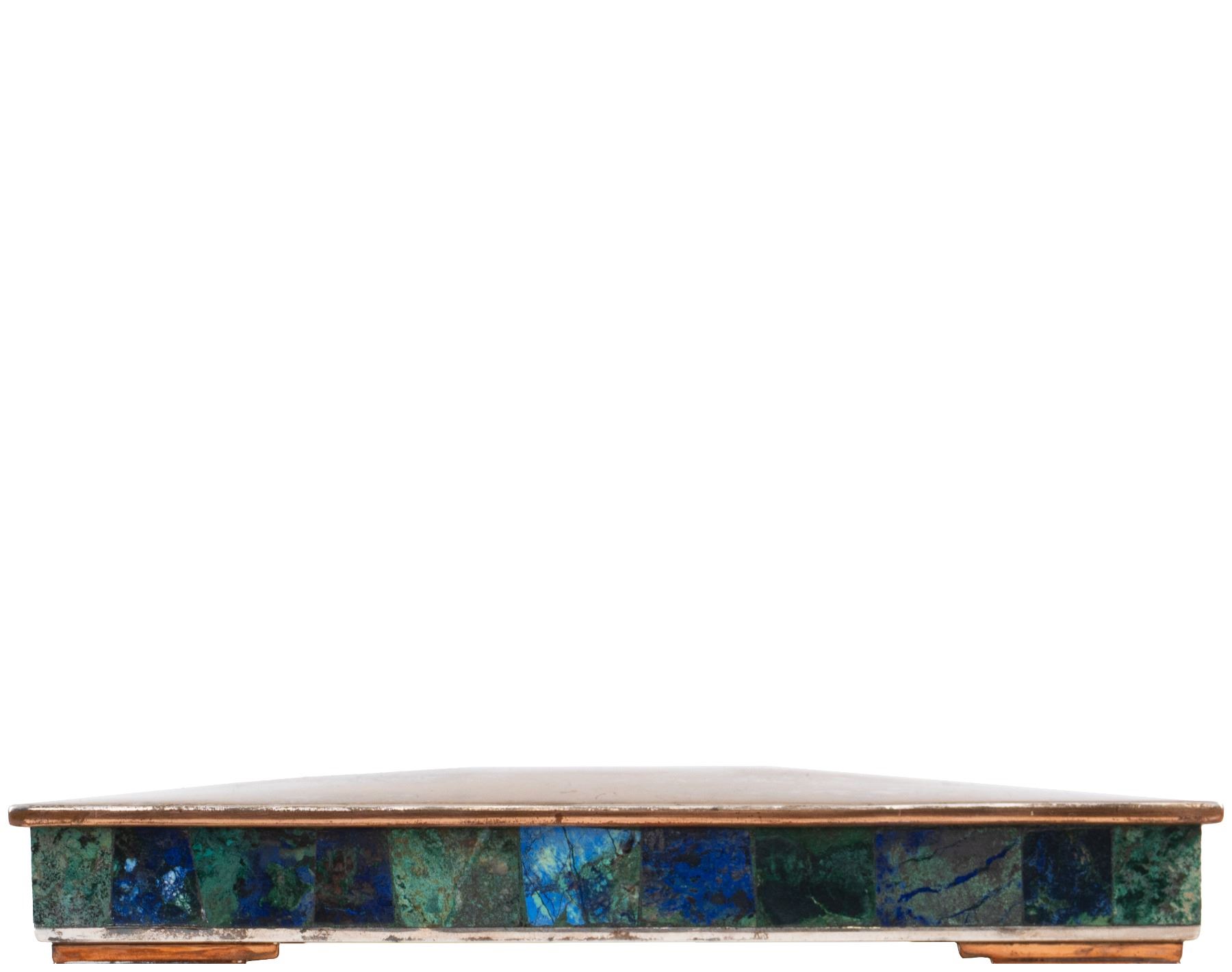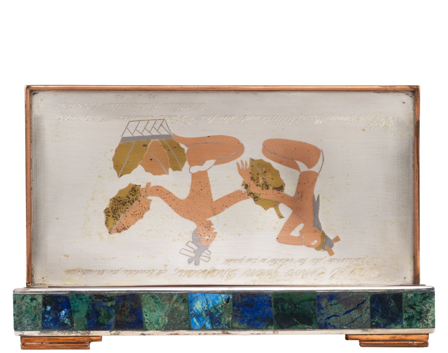 Rectangular with stepped bracket feet and sides of hardstone mosaic, probably malachite, the cover inlaid through with copper and brass figures of Aztecs, cedar lining. Marked Los Castillos Sterling Hand roughed, engraved dedication to jean Drapeau by Mexican president Alvarez and dated 29-IIi-73, Provenance Estate Jean Drapeau \ Librairie Bonheur d'occasion