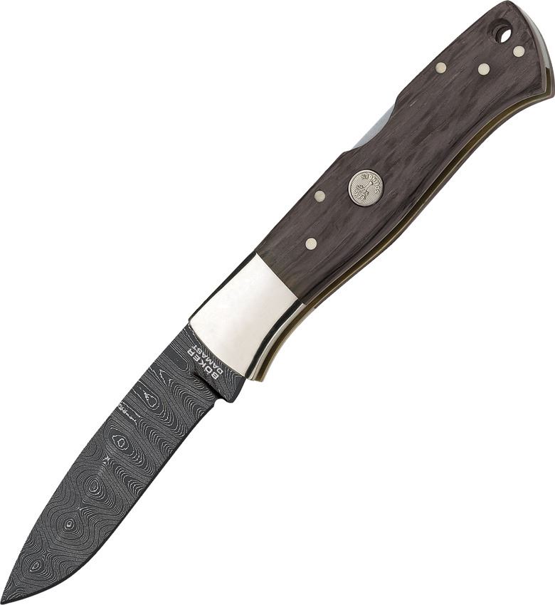 "4 1/4"""" closed. 3 1/4"""" hand forged ladder Damascus steel blade. 3000 year old bog oak handles with polished nickel silver bolster and inlay shield. Lanyard hole. Comes in premium presentation box with Damascus certificate.