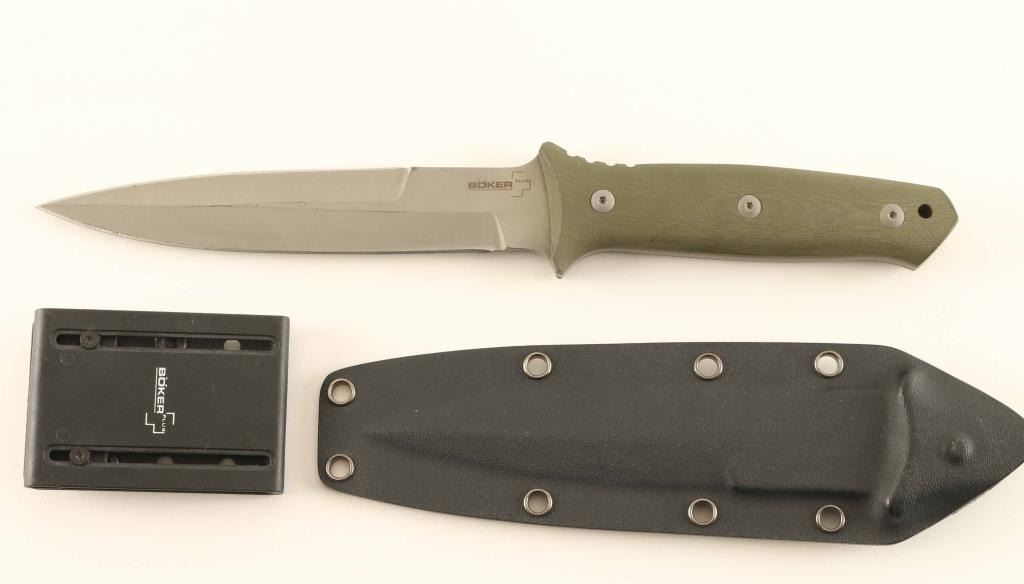 Carbon steel 6 1/4" blade, 11 3/4" overall with composite ODU green handle. Plastic sheath with belt clip.