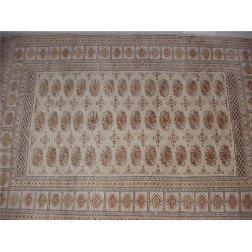 A beautiful 20th century borhara carpet, 75" X 112" not including the 2 1/2" fringe on each end. Beige ground with medallion covered field and border.
