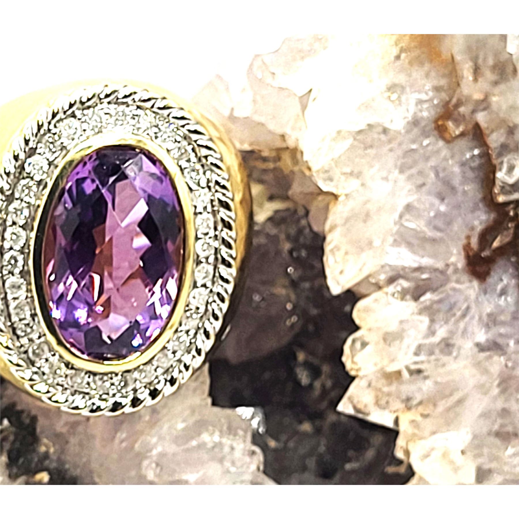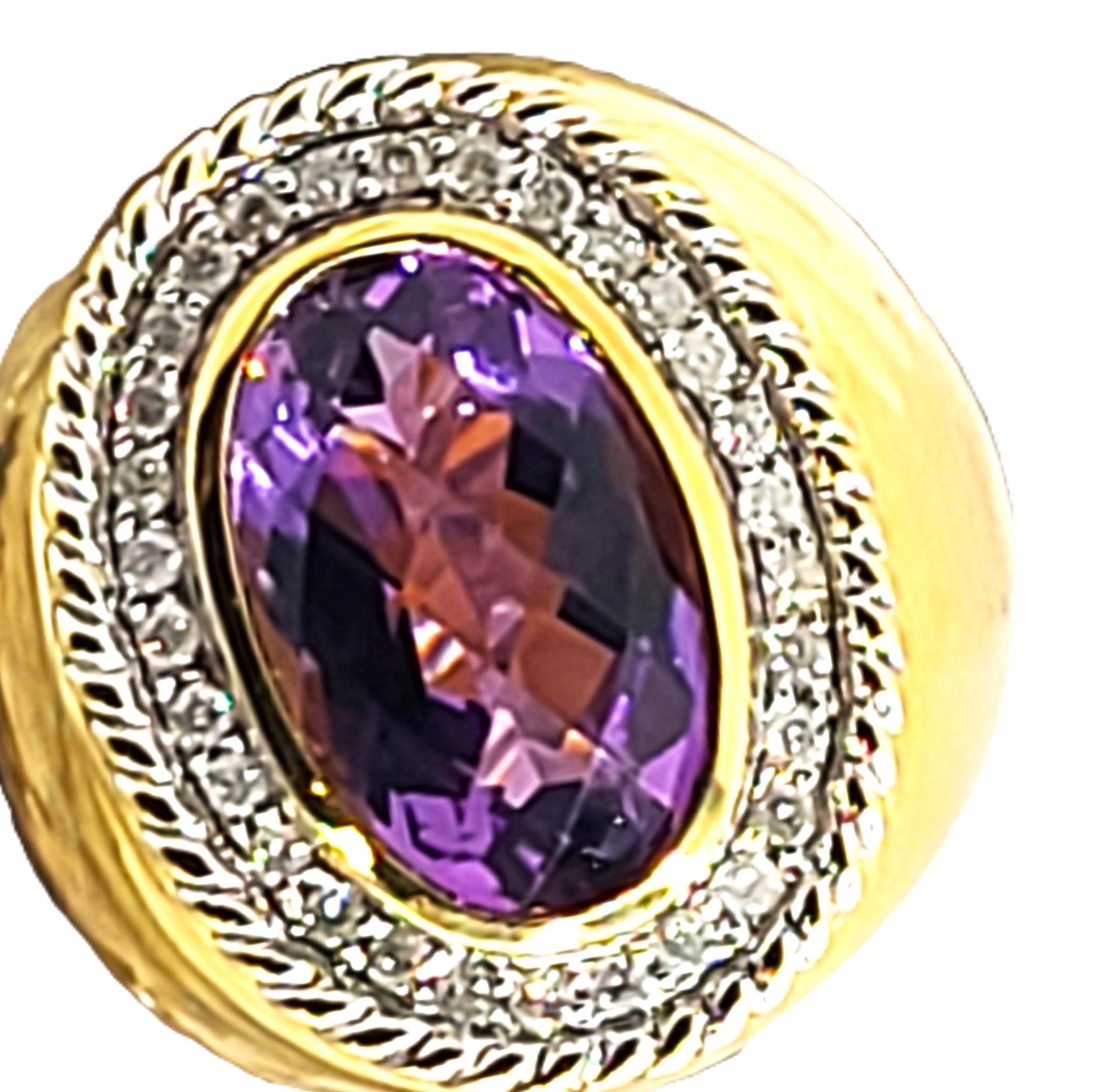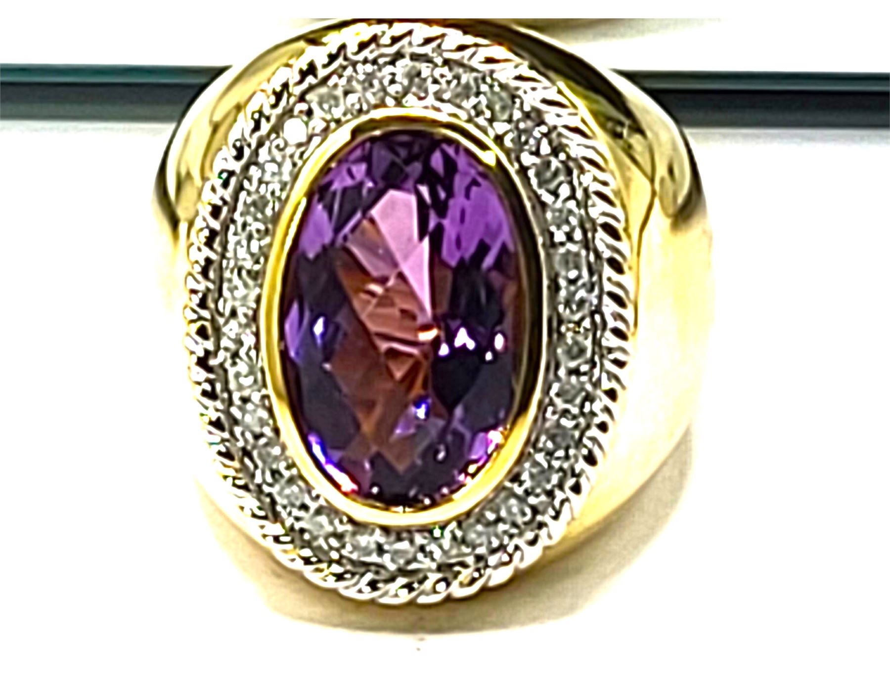 This 14 karat yellow gold ring features an approximate 8.00, carat top-faceted amethyst with wide polished shoulders twisted rope frame . The top of the ring is approximately 1 1/8" along the top of the finger and has a supportive gallery. The shank is approximately 5.5mm. This ring is US size 8 and can be sized for an additional charge. Please contact Bidfair Fine Jewelry for sizing details. Admin:33109/17eal