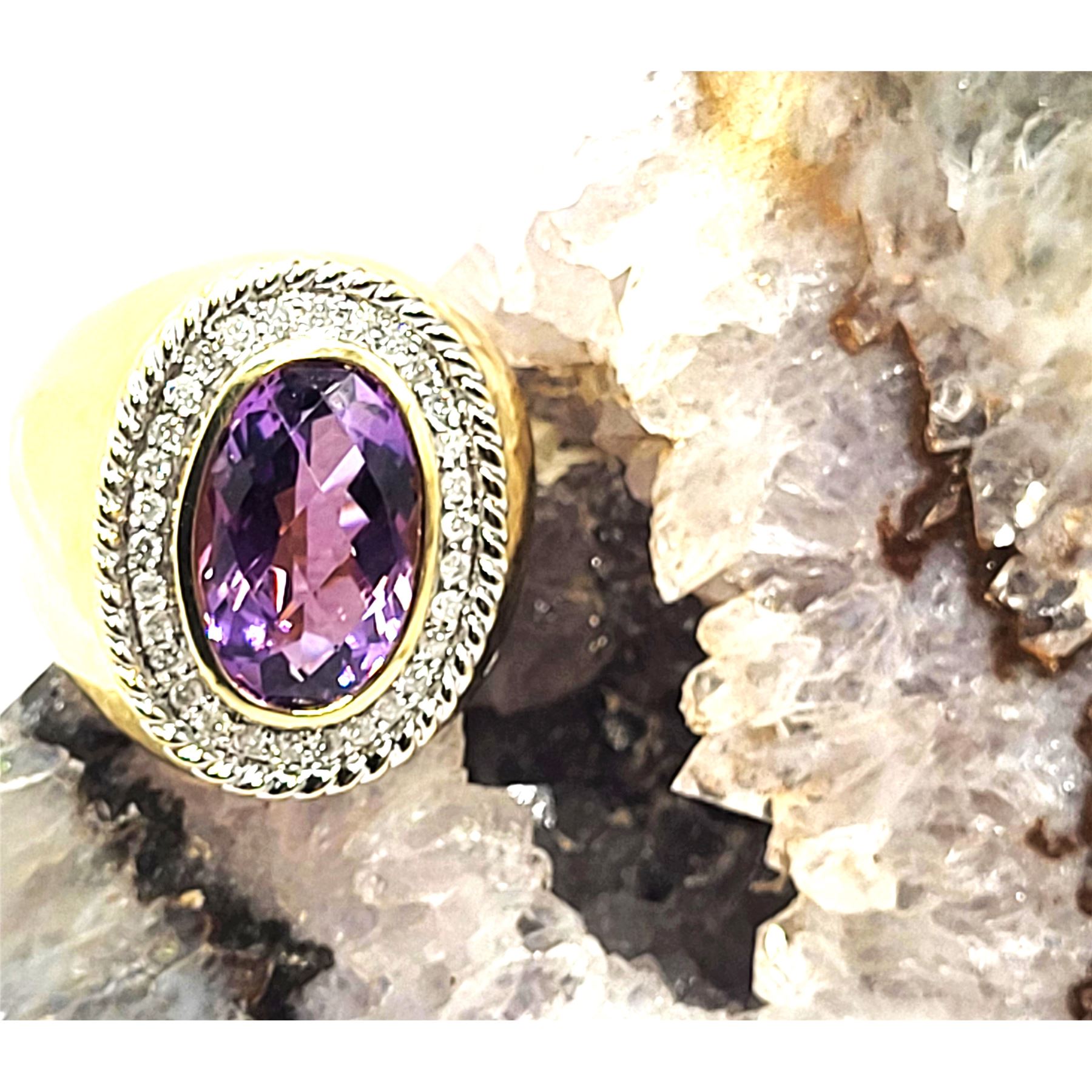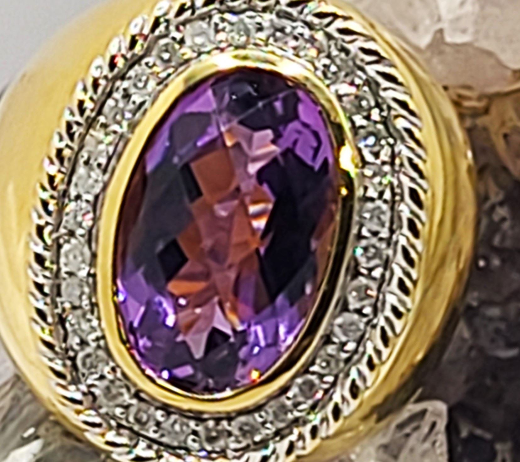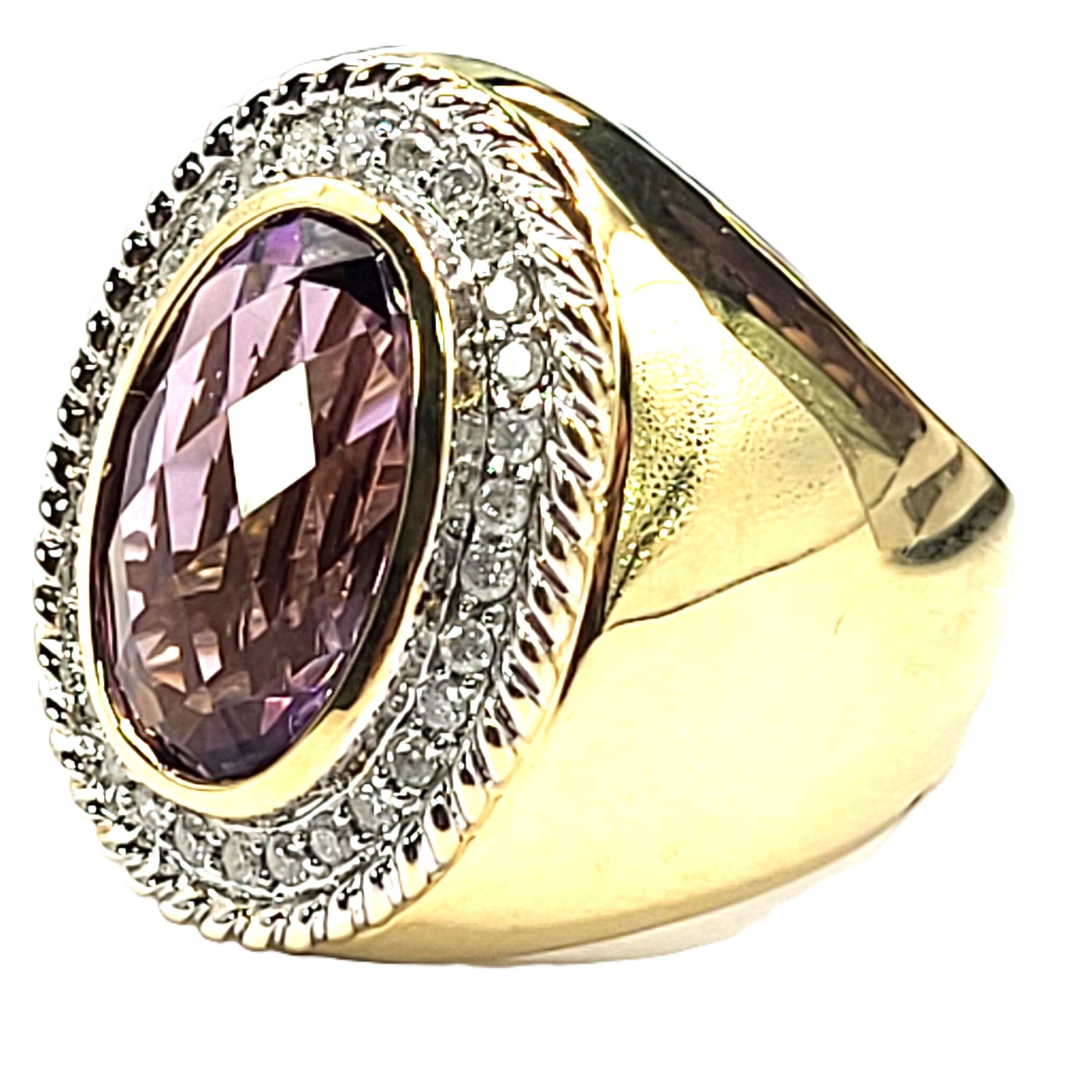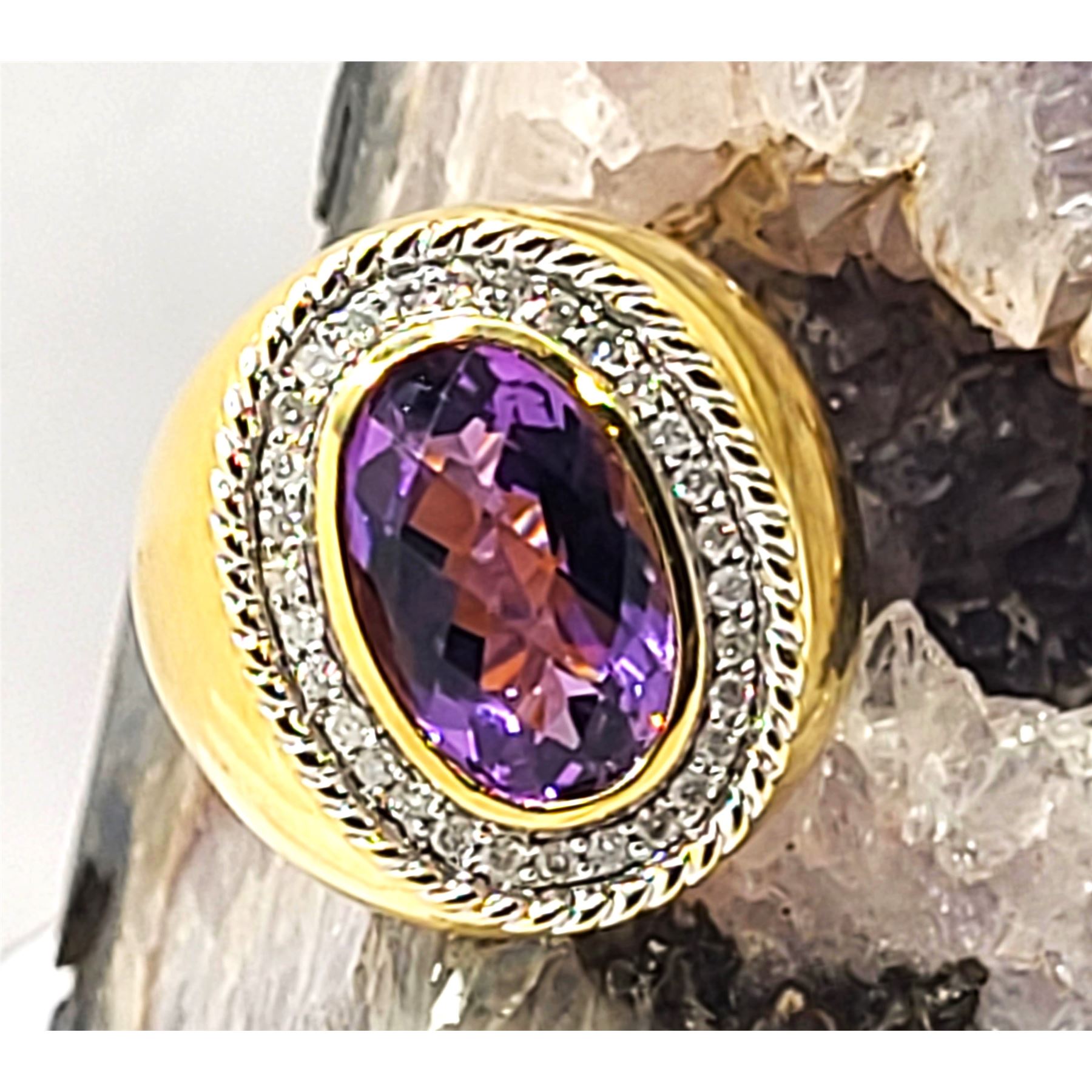 This 14 karat yellow gold ring features an approximate 8.00, carat top-faceted amethyst with wide polished shoulders twisted rope frame . The top of the ring is approximately 1 1/8" along the top of the finger and has a supportive gallery. The shank is approximately 5.5mm. This ring is US size 8 and can be sized for an additional charge. Please contact Bidfair Fine Jewelry for sizing details. Admin:33109/17eal