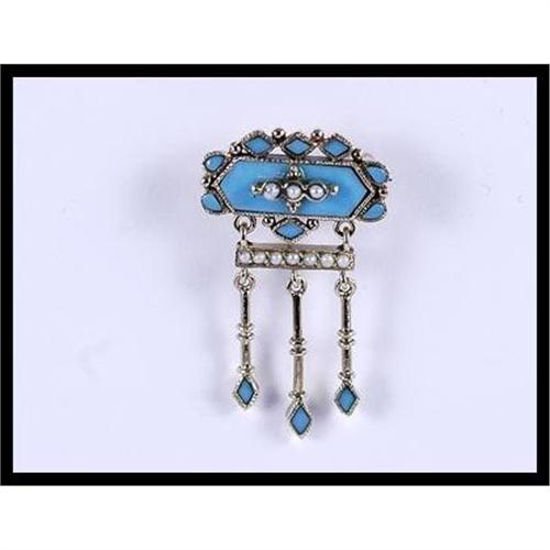 Bold pin with turquoise and 10 seed pearls set in 9K yellow gold. The pendant measures 31.5 millimeters (1.24 inches) x 18.3 millimeters (0.72 inches) and weighs 3.20 grams total weight.