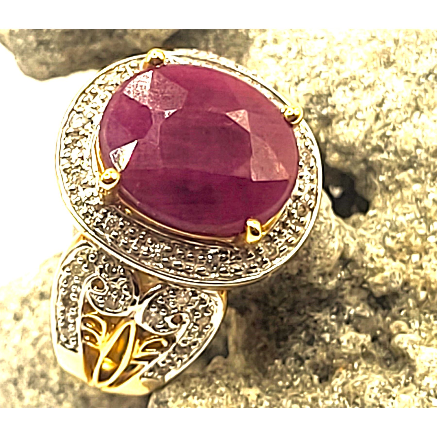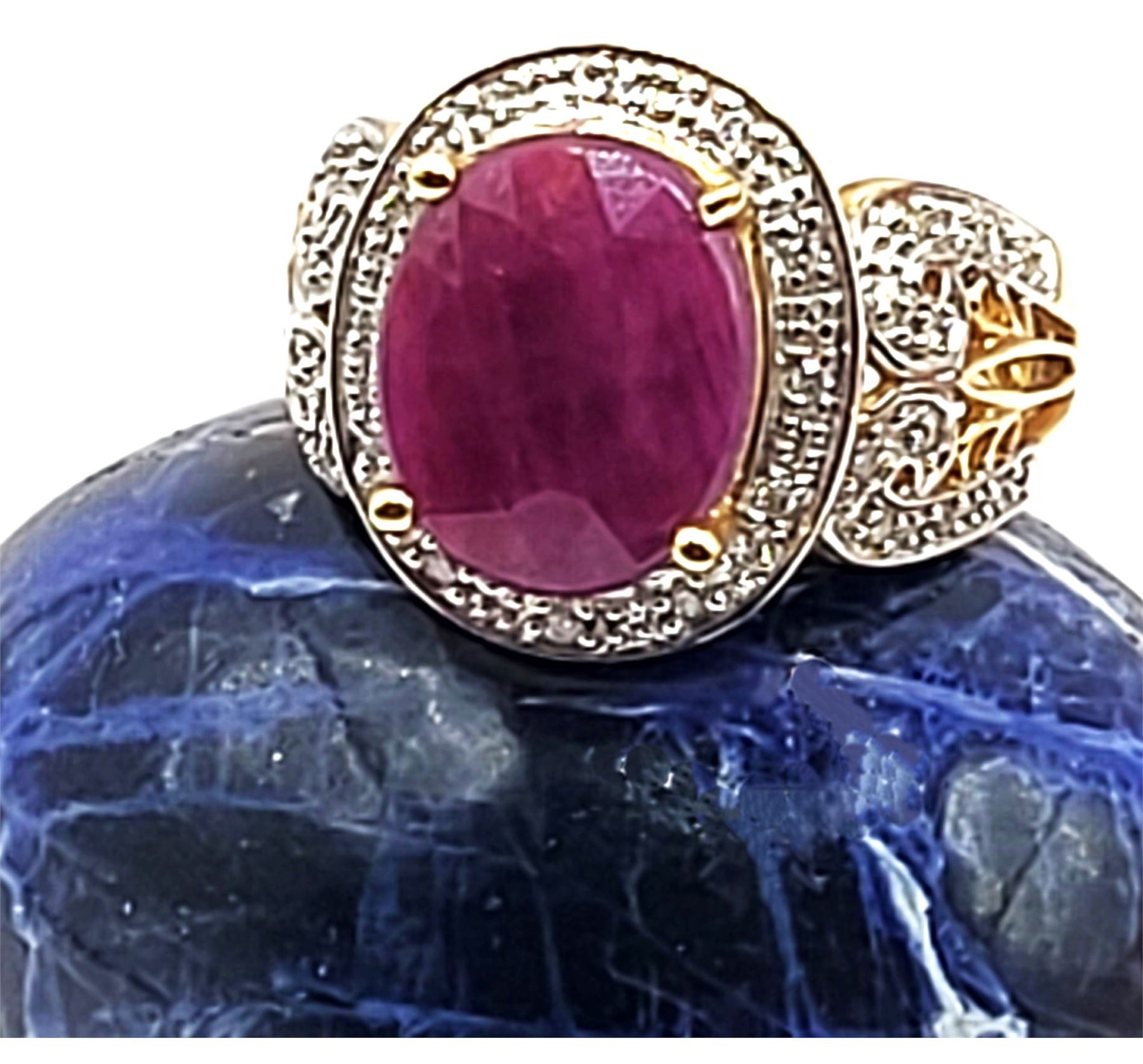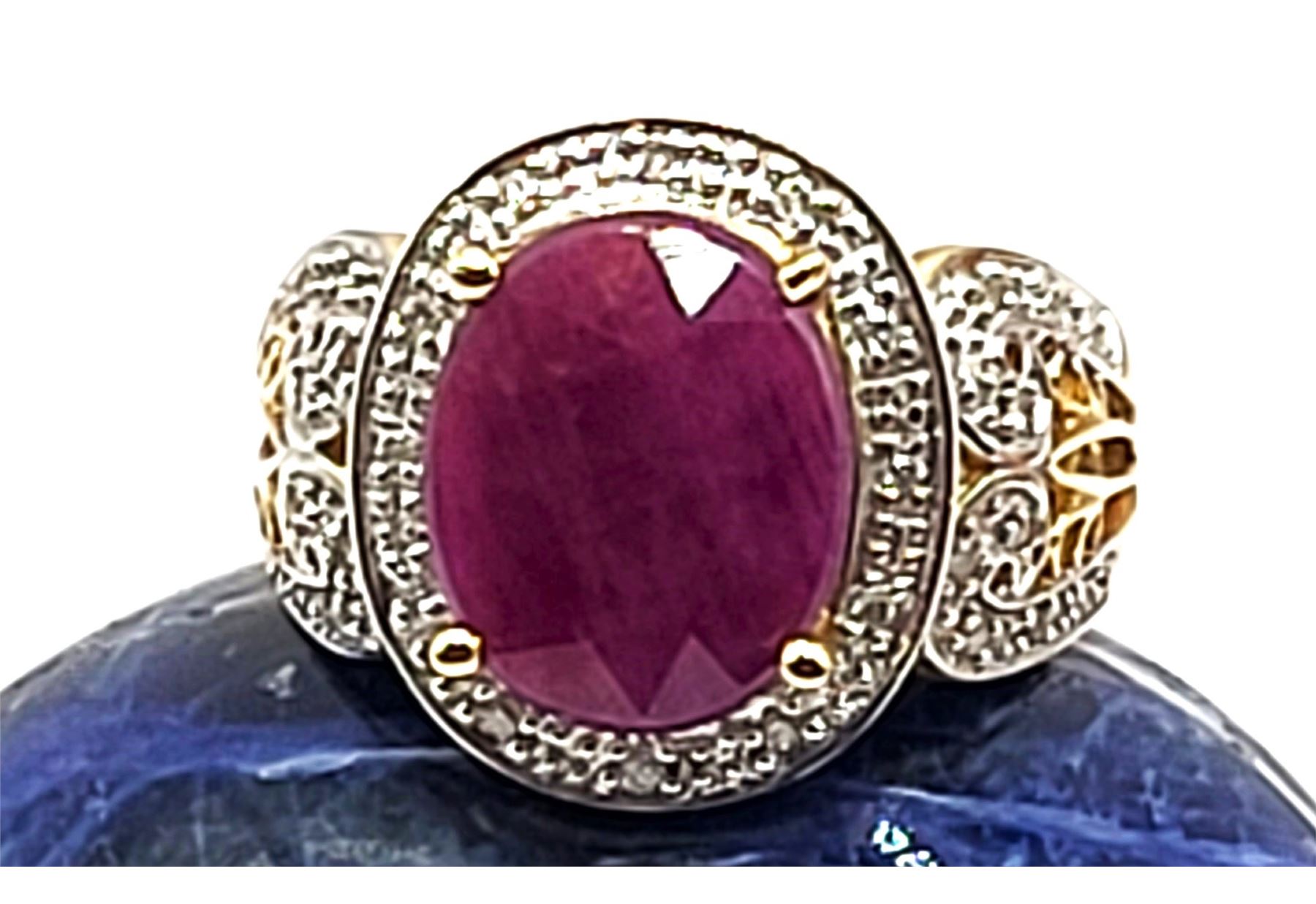 An approximate 5.00 carat, oval-cut, genuine ruby is prong-set atop a swirled bridge gallery and floating diamond and rhodium halo. Looped, open shoulder with diamond and rhodium accent are decorated with tendril-like scrollwork that tapers to a polished, solid 2.5mm shank. The ring has an open under gallery and is US size 7 (with the open gallery, it fits more like a 7.5). It can be sized for an additional charge. Please contact Bidfair Fine Jewelry for sizing details.