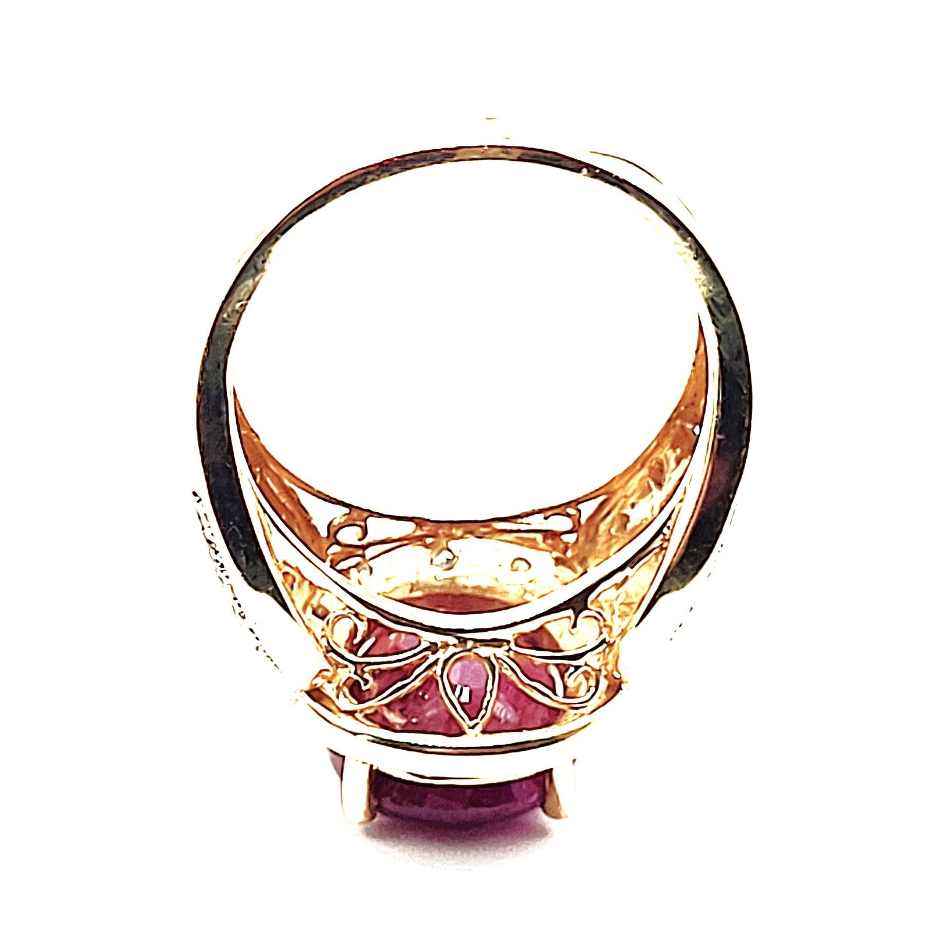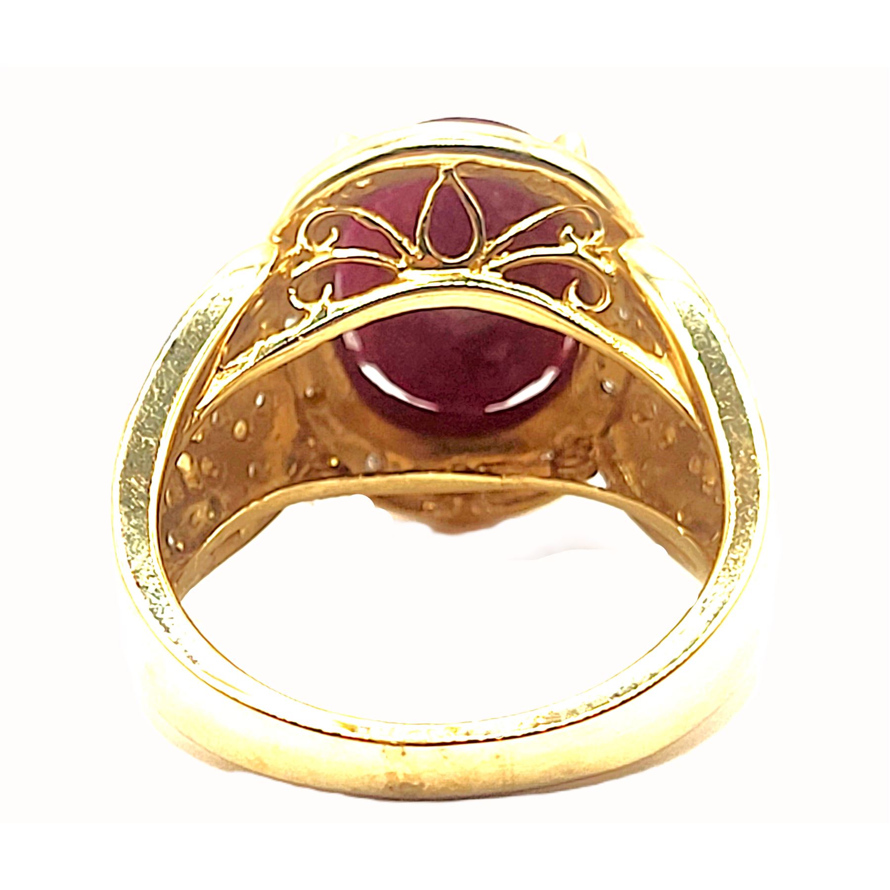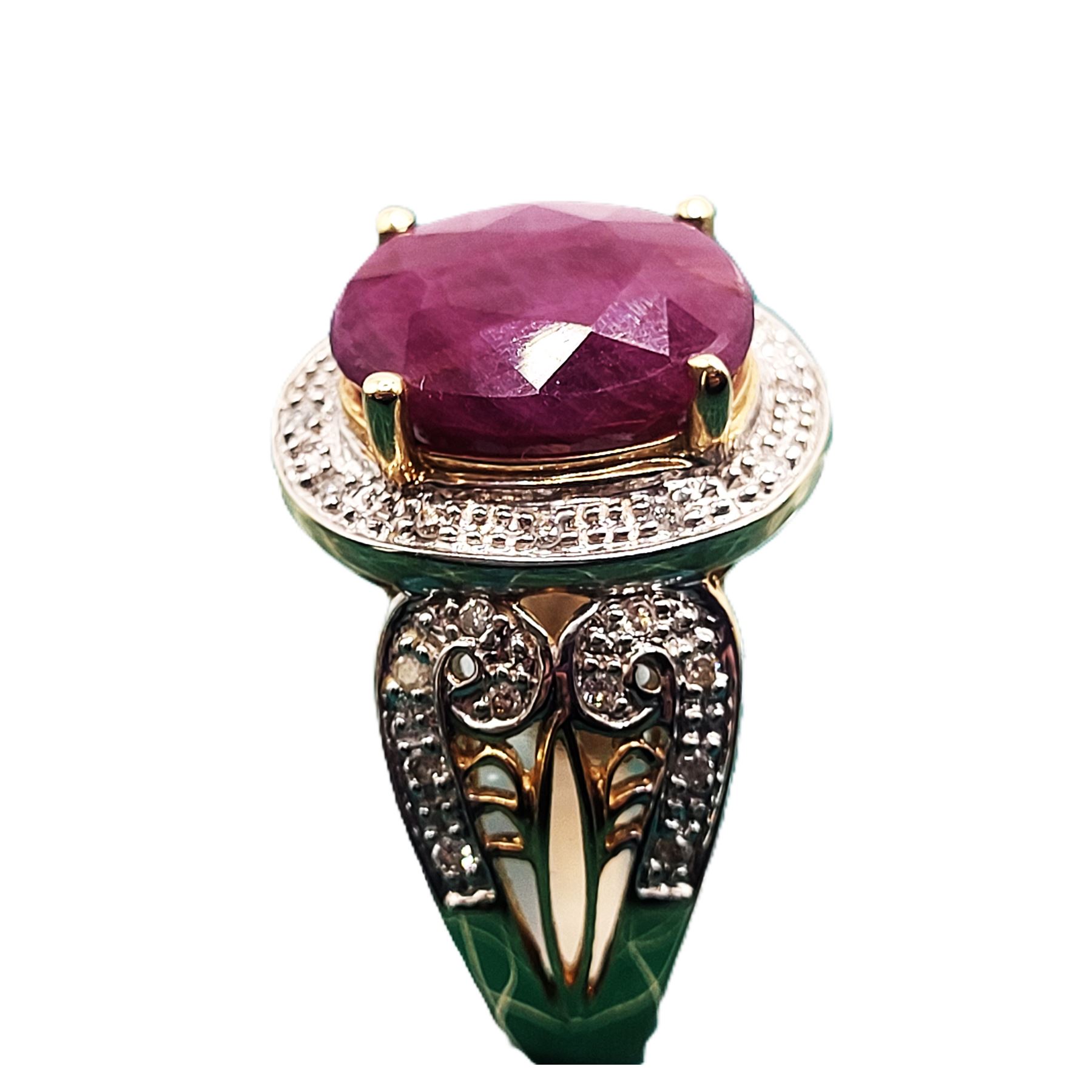 An approximate 5.00 carat, oval-cut, genuine ruby is prong-set atop a swirled bridge gallery and floating diamond and rhodium halo. Looped, open shoulder with diamond and rhodium accent are decorated with tendril-like scrollwork that tapers to a polished, solid 2.5mm shank. The ring has an open under gallery and is US size 7 (with the open gallery, it fits more like a 7.5). It can be sized for an additional charge. Please contact Bidfair Fine Jewelry for sizing details.