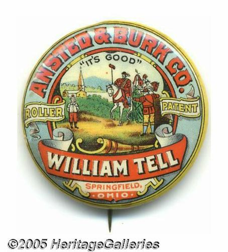 <B>Bold Bright Colors William Tell Flour Advertising Pin</B></I> Pin shows a scene of William Tell ready to shoot the apple from the boy's head. Rich color gives this advertising pin general appeal to any collector. The celluloid pin has very light foxing around the bottom of the curl, which cannot be seen from the front of the button, and is missing the back paper. The button is marked "Whitehead and Hoag Co." along the curl. Size 1.25". Lot:252