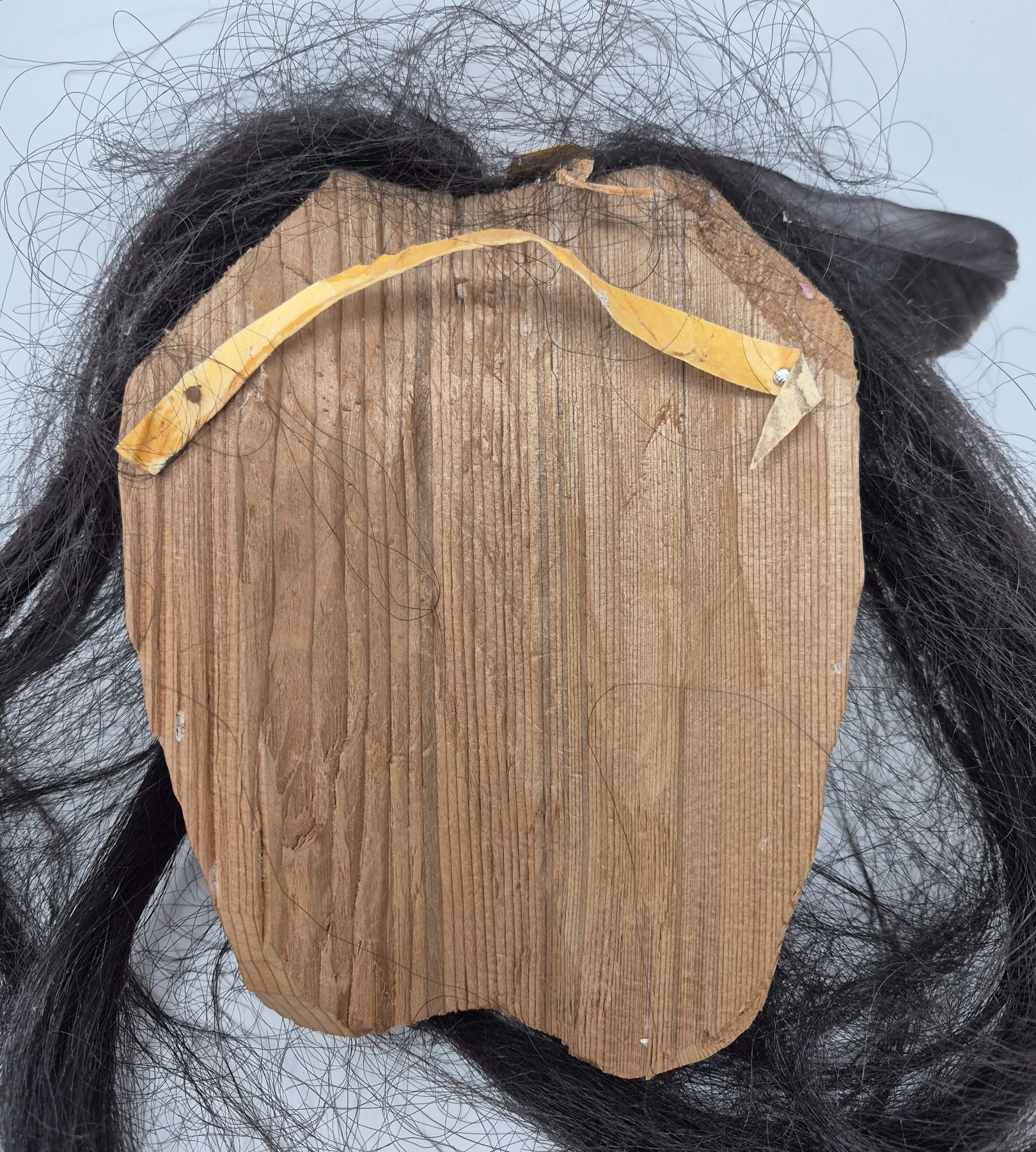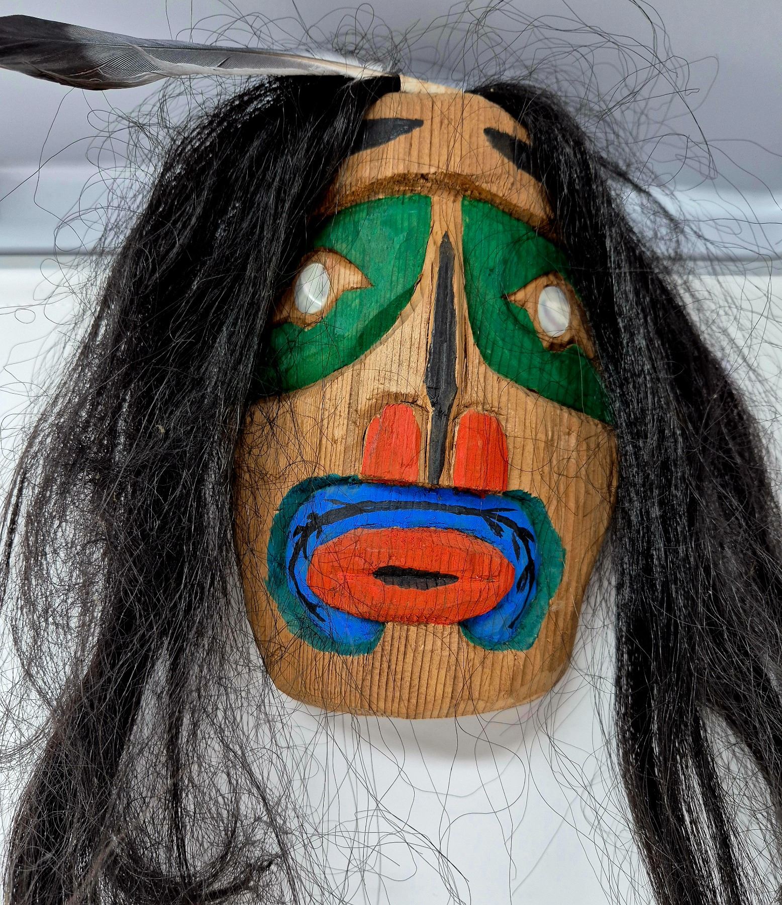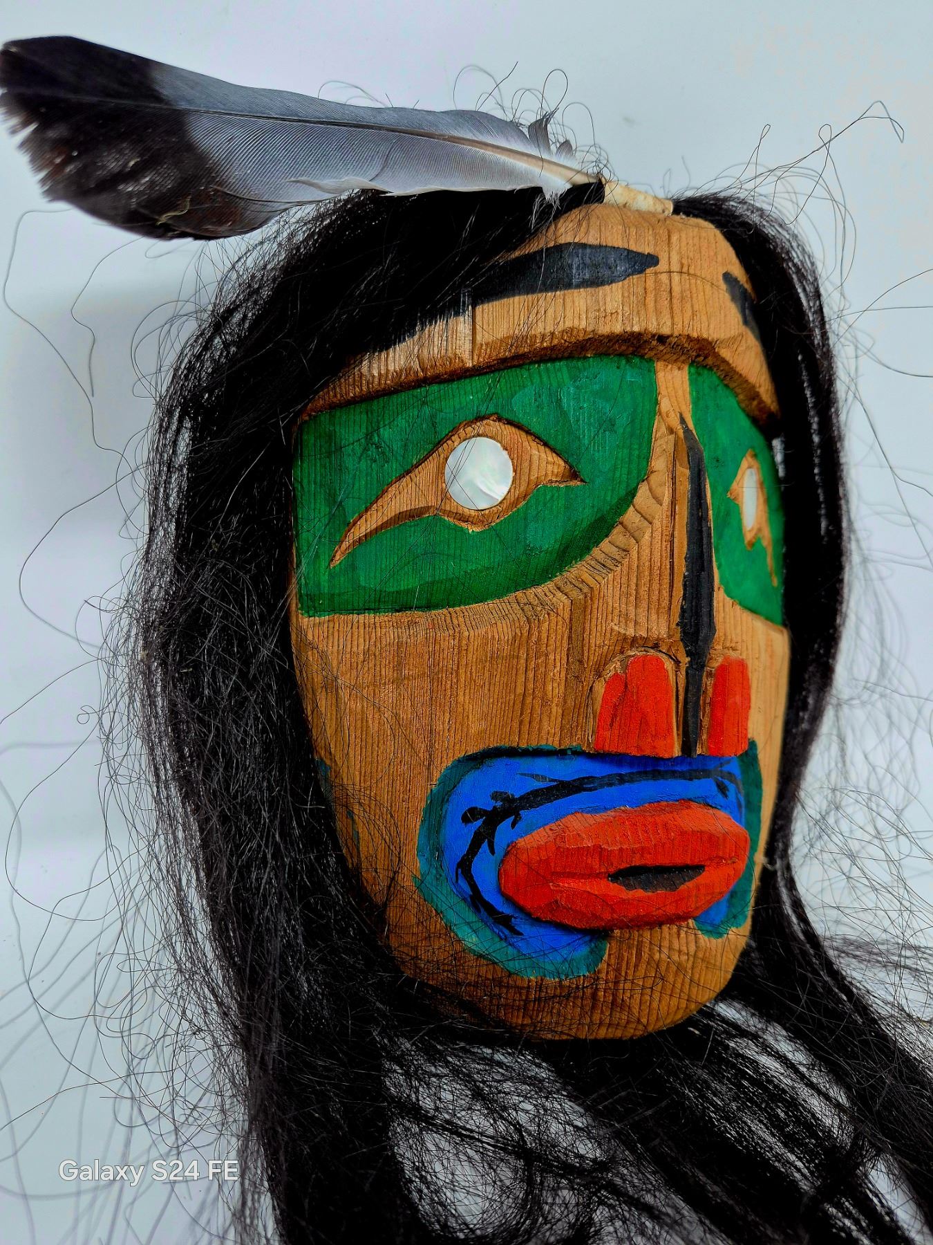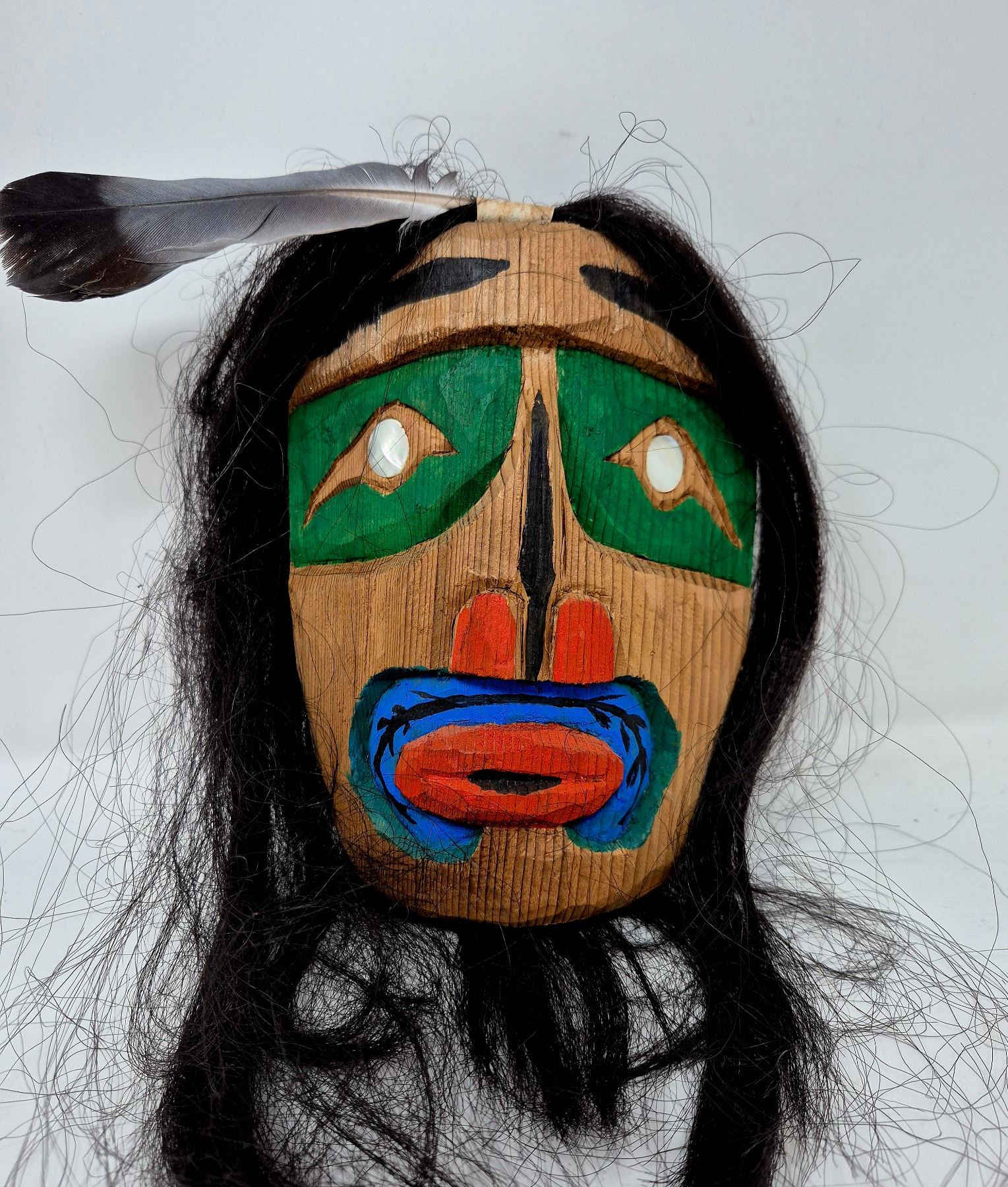 Colorful wooden mask with expressive paintwork, inlaid eyes, flowing hair, and feather detail. Great wall piece with tribal-inspired character.