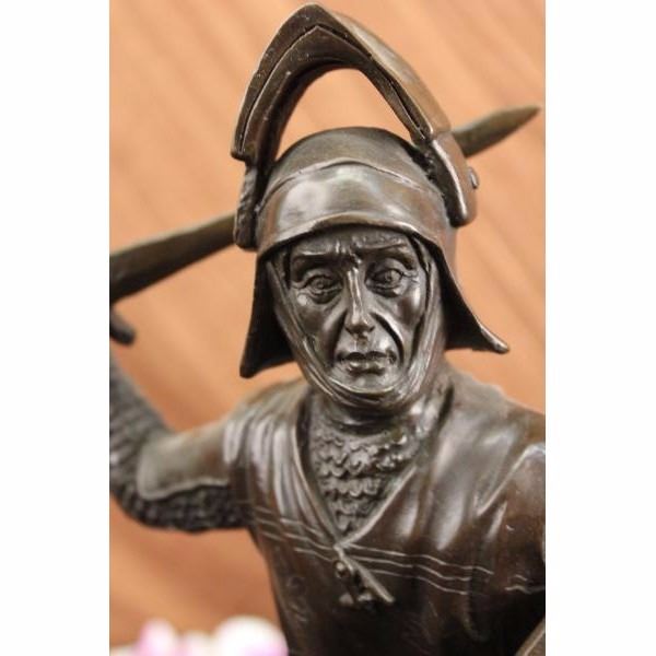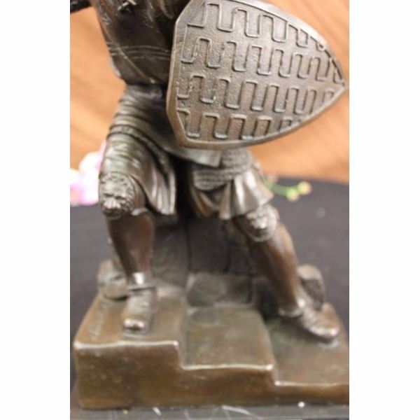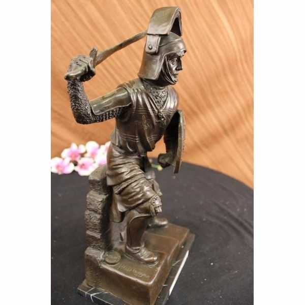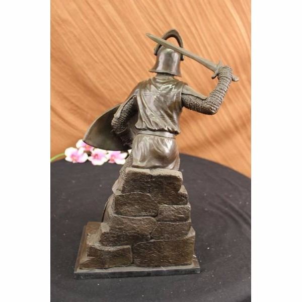 The Bold Knight, In Attempts To Seize His Adversaries Castle, Wields His Mighty Sword In Preparation Of An Attack. The Full Armor Was Created With Great Detail And Accuracy. He Seen Wearing A Coif Which Was Neck Guard Under His Helmet. Under His Breast Plate, He Wears An Iron Meshed Gauntlet For Added Protection. His Knees Are Protected By Knee Cops That Are Decorated With Two Valiant Lion Heads. The Handmade Bronze Sculpture Was Molded Using The Ancient Method Of Lost-Wax Casting And Stained With A Brown Patina Finish For Preservation. It Is Mounted Upon A Black Marble Base. Bronze Dimensions With Marble Base: Height 16 X Width 11 inches. Weight: 15 Lbs.