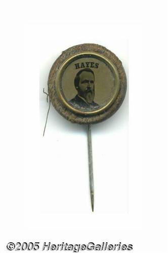 <B>Bold Rutherford Hayes Ferrotype Stickpin</B></I> This 16 mm stickpin contains a bold ferrotype portrait of "Hayes" within a plain, raised brass rim, surrounded by a cloth covered frame. There is some loss to the fabric covering, but this is only apparent under magnification. It is quite a specimen for a tough candidate. Lot:259