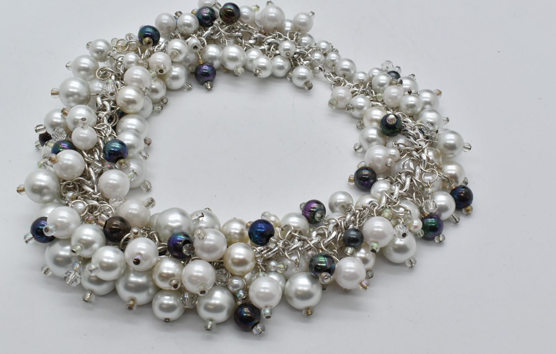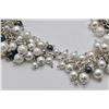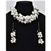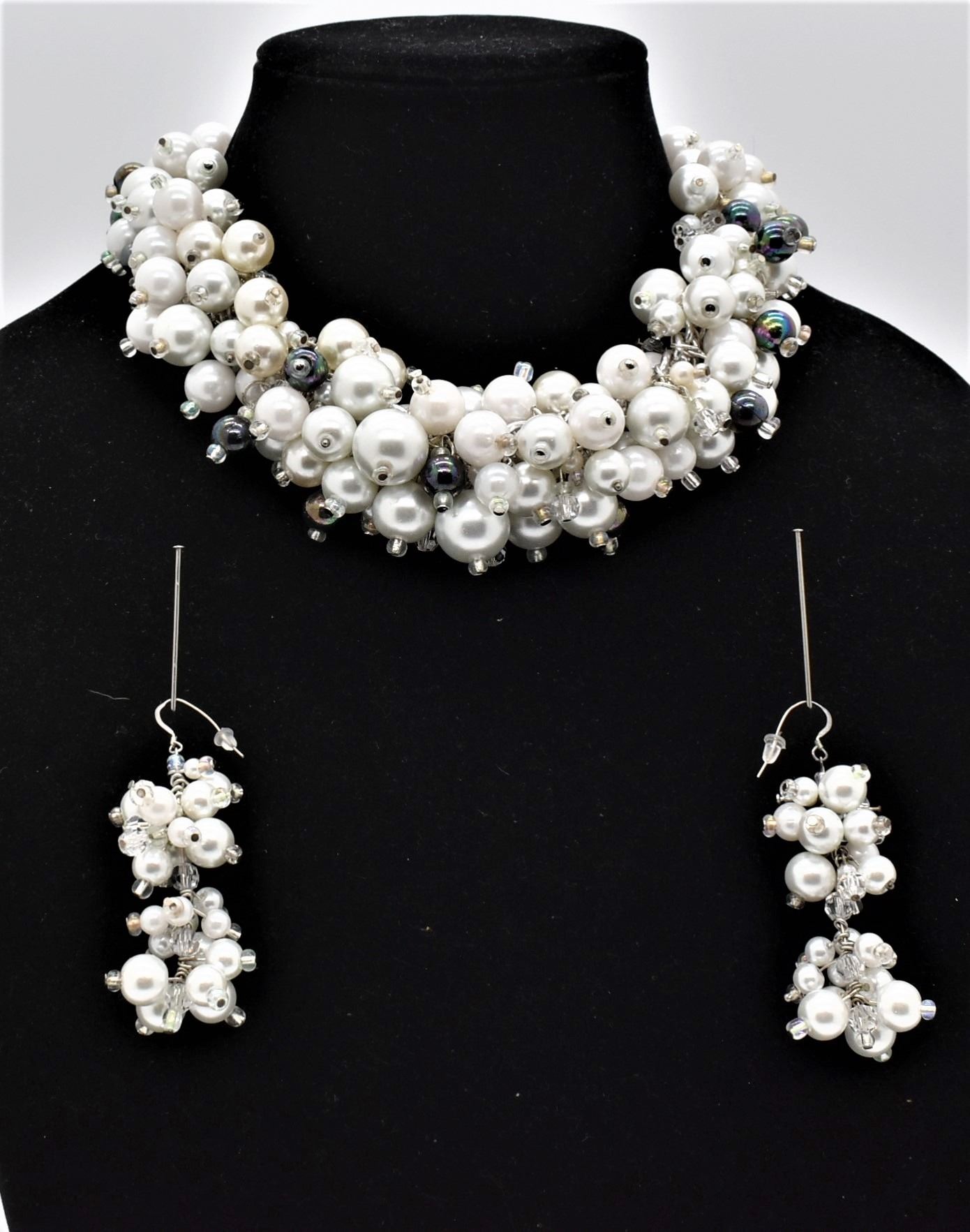 Bold Statement Pearl Cluster Choker and Earrings, choker of both white and platinum faux pearl beads with Swarovski faceted crystal bicones, the use of aurora borealis peacock beads is mixed throughout and the shimmering colors of purple and green provides added interest, the largest bead is 16mm, earrings have double clusters of cascading pearls, on French wires, mixed with aurora borealis crystal beads compliment the ensemble, the earrings have a drop of 2.5'', the choker is constructed on a nickel curb chain with a lobster clasp, measuring 18'' with a 3'' extender