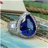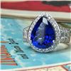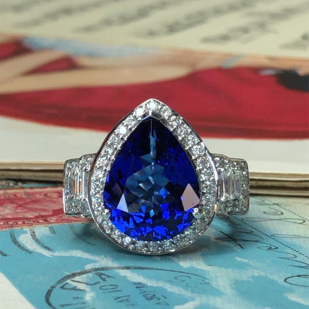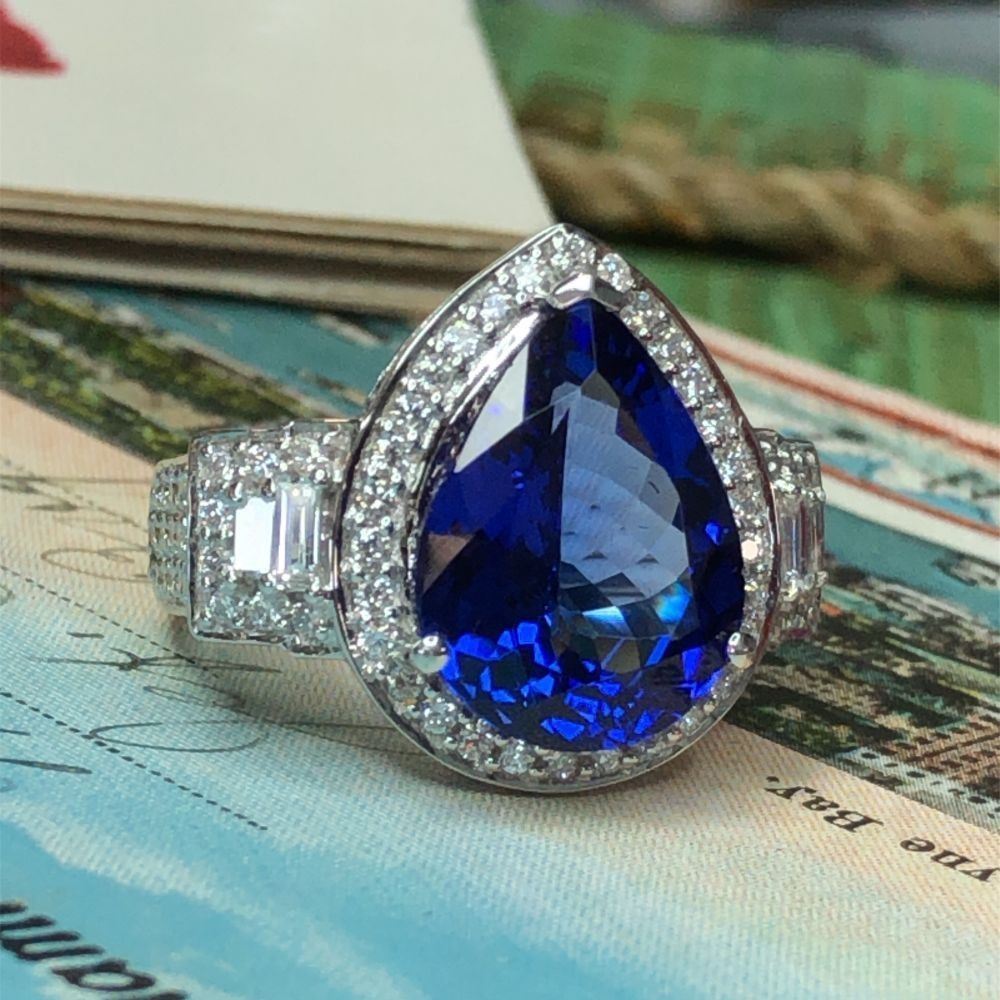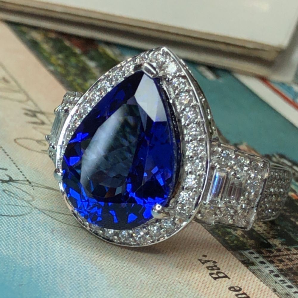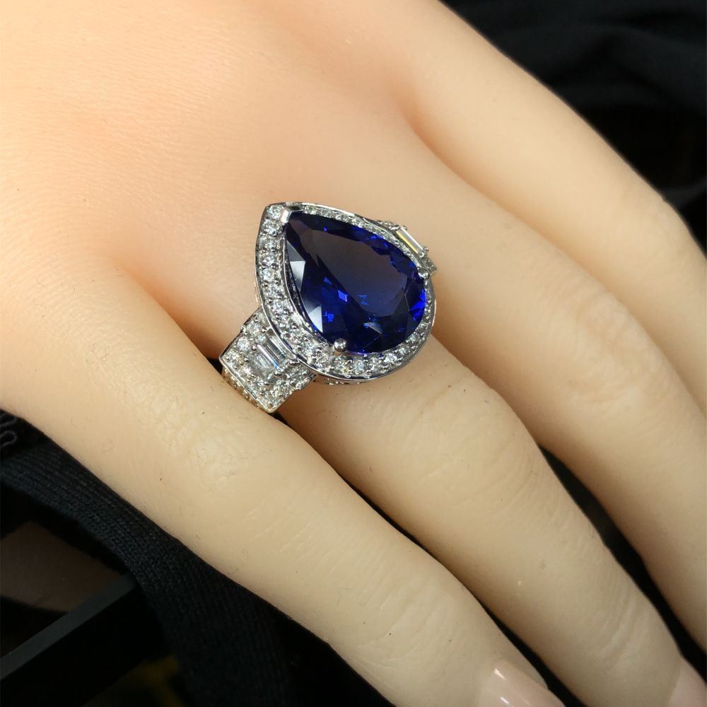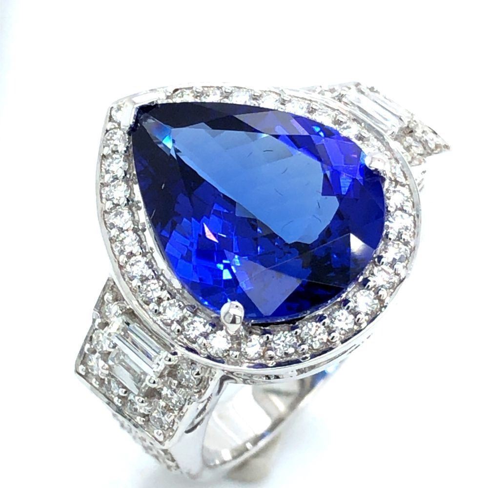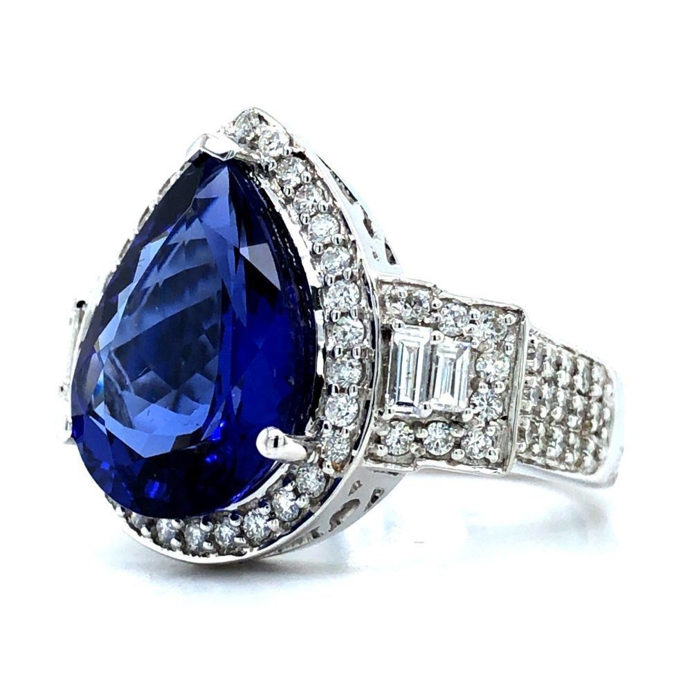 ADDITIONAL INFORMATION:& nbsp; This is an amazing white gold ring that features pear-cut tanzanite that is prong-set with baguette and round, brilliant-cut diamonds in the halo and impressive stepped shoulders. This ring has a scrolling gallery and an approximate 4 mm shank.