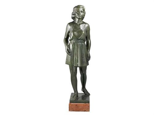 Cast bronze with patina, marble base. Marked on the base: Boldogfai Farkas S. Size: 73 cm