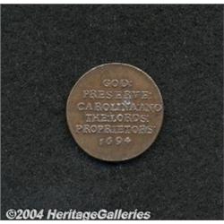 <table><tr><td><table><tr><td>Bolen copy of 1694 TOKEN Carolina Elephant Token, PROPRIETORS AU58 Reverse Spot Removed Uncertified. 12.1 grams. According to Richard Kenney, "John Adams Bolen (1826-1907) of Springfield, Mass. was the most widely known and most prolific engraver of struck copies." This well made 19th century replica is a close copy but differs on the tail of the 9 in the date, the leg of the R punch, etc. A bold and impressive chestnut-brown example with a whisper of gray verdigris on the elephant's jaw. A small spot has been removed above the N in CAROLINA. <BR><BR><B>Important notice:</B> Heritage usually auctions material at the rate of 200-250 lots per hour. On some occasions eBay Live bid software or the Internet may not be able to keep up with the pace of the auction. We recommend placing a realistic absentee bid now as insurance to avoid disappointment. Occasionally the auctioneer may eliminate or reject an eBay Live bid, and the auctioneer may also reopen a lot after the close of the eBay live bidding (usually because we missed an audience bid), and may reject your bid even if it shows you as the winning bidder. By bidding via eBay Live, you agree that Heritage may award the lot to another bidder at its sole discretion under the circumstances described above or any other reasonable circumstances. Since eBay bids are not shown to us until we open the lot on the floor, we treat those bids just like floor bids. In most cases the floor responds before the eBay bid is presented to us, due to Internet lag time, so for consistency we have made it a policy that floor bids are always considered first over tie eBay live bids. Also please note that all Heritage lots purchased through eBay Live carry a 20% Buyer's Premium. Please make sure you read the Terms and Conditions before you bid. <BR><BR><B>IMPORTANT ANNOUNCEMENT ABOUT RESERVES:</B> Heritage now divulges all reserves on its web site 7 days before every auction. If you want to know whether the reserve on this lot has been met, and if not, what the reserve amount is, please visit this lot page on the HeritageCoin.com web site, or email: bid@HeritageGalleries.com </span></font></td></tr></table></td></tr></table>