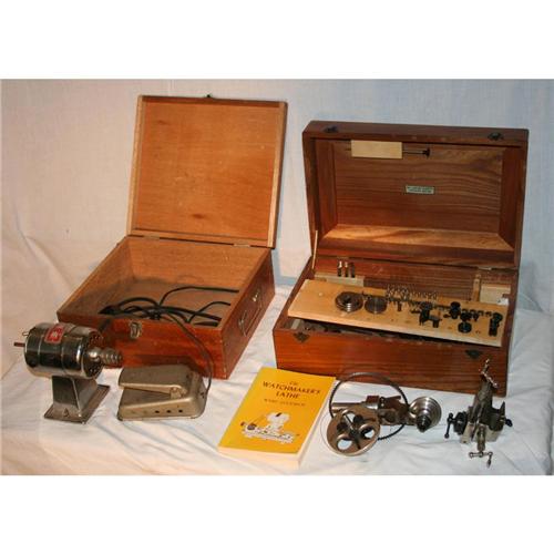 Boley Watchmaker’s Lathe in two wooden cases which measure 15" W X 9 ½" D x 6" H and 12" X 11" x 5" respectively. Some peeling of veneer on cases. Comes with book The Watchmaker’s Lathe by Ward Goodrich.