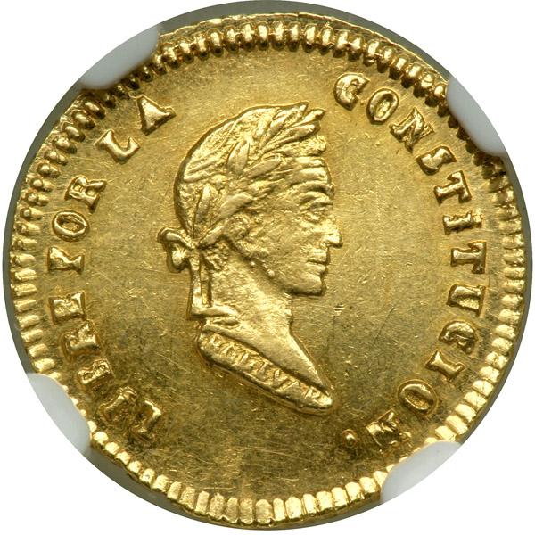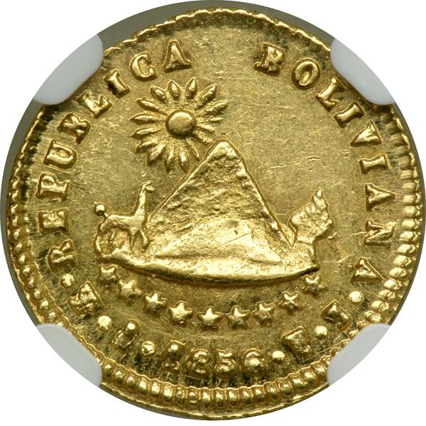 Bolivia. ½ Escudo, 1856-FJ. Fr-36; KM-113. Laureate head of Bolivar right. Reverse: Arms. Sharp and lustrous example. NGC graded MS-62.