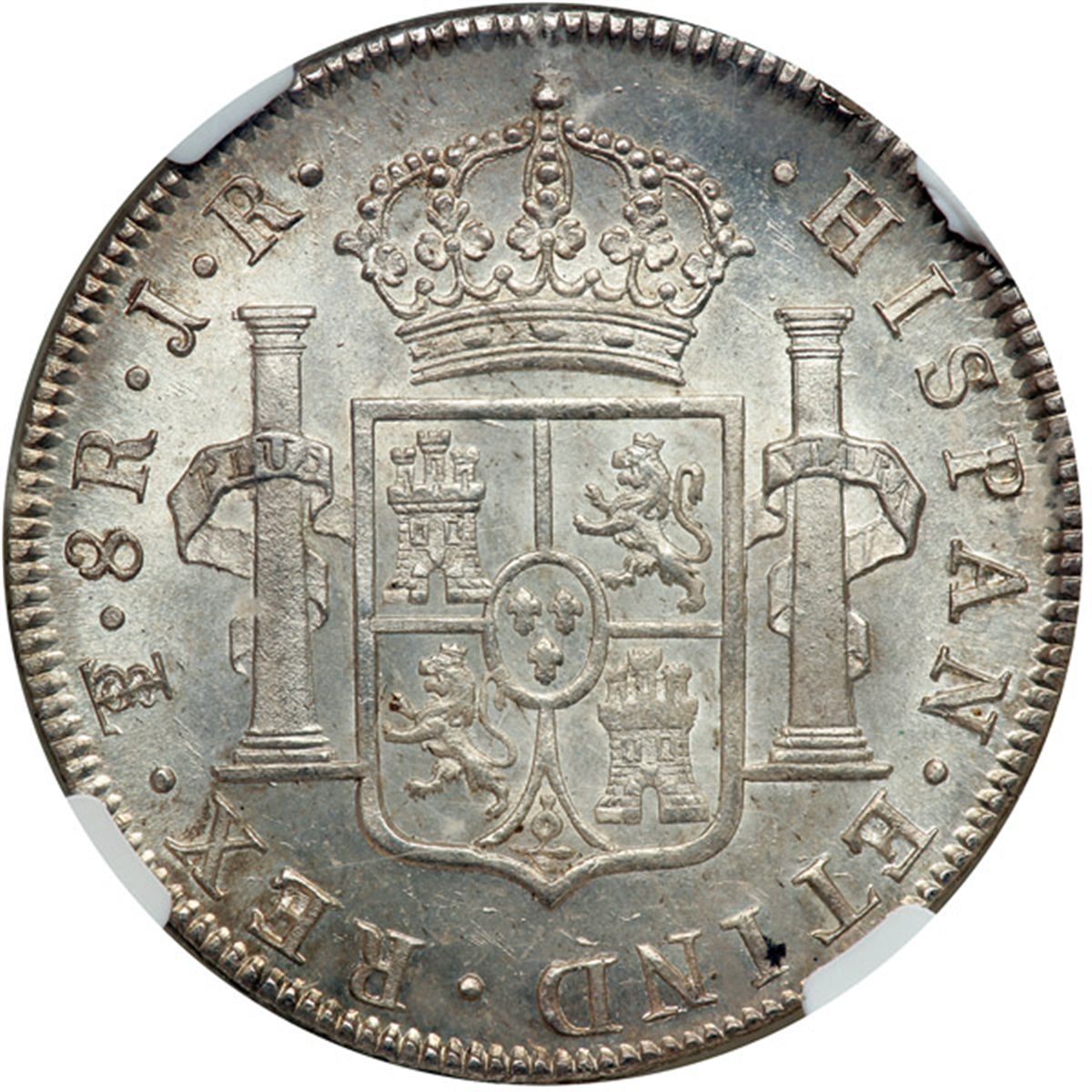 Bolivia. 8 Reales, 1774-JR (Potosi). Eliz-12; KM-55. Charles III, 1759-1788. Laureate, draped, and cuirassed bust of Charles III right. Reverse: Crowned Bourbon arms, flanked by bannered pillars. Sharply struck on both sides with reflective obverse fields and full original mint fresh luster. NGC graded MS-64.