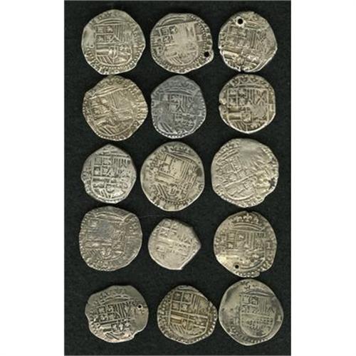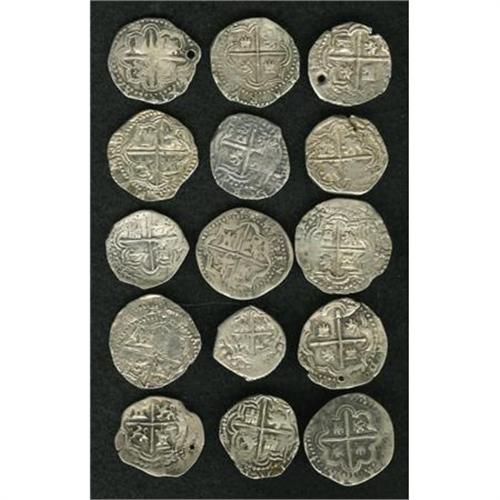 <B>Felipe II cob 1 Real Study Selection,</B></I> fifteen coins, all with P mintmark to the left of the shield, and with the following assayer's initials below: Assayer P (2), Assayer R (2) and Assayer B (11). The conditions are mostly Fine to VF with four holed. <B>Sold as is, no return lot.</B></I><BR><BR><b>Shipping:</b> Coins & Currency (<a target="_blank" href="http://www.heritageauctions.com/common/shipping.php">view shipping information</a>)