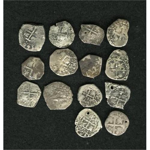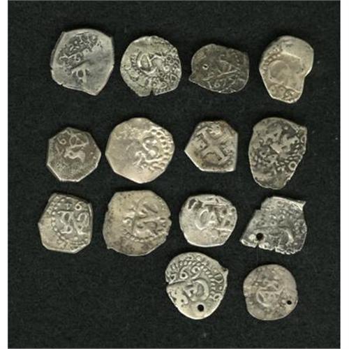 <B>Carlos II cob 1/2 Real Study Group,</B></I> KM22, fourteen coins, all with at least a partial date and including: 1668, 1675, 1682, 1684 (2), 1685 (3), 1688, 1694 (2), 1697 (2) and 1701 Lima with Carlos II monogram. Grades are generally F-VF with three holed examples. <B>Sold as is, no return lot.</B></I><BR><BR><b>Shipping:</b> Coins & Currency (<a target="_blank" href="http://www.heritageauctions.com/common/shipping.php">view shipping information</a>)