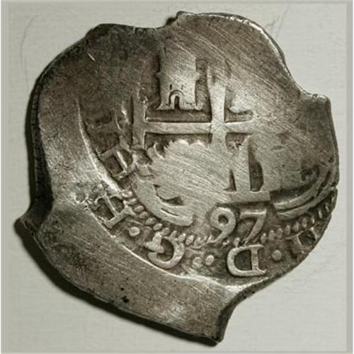 <B>Carlos II cob 8 Reales 1697-CH,</B></I> KM26, crudely struck F-VF, two dates although the obverse version is a bit weak, clearly readable P and CH. Scarce assayer for this date.<BR><BR><b>Shipping:</b> Coins & Currency (<a target="_blank" href="http://www.heritageauctions.com/common/shipping.php">view shipping information</a>)
