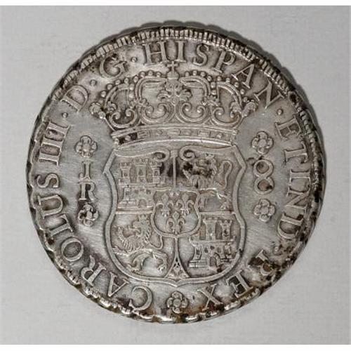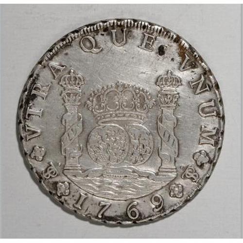 <B>Carlos III Pillar 8 Reales 1769-JR,</B></I> KM50, normal 9, no dot after Carolus, dot over both mintmarks, 4 petaled rosette, appears to be an overdate, possibly 9/7, bold XF, lightly cleaned with some residual surface oxidation, small attempted piercing above the right pillar. <B>Sold as is, no return lot.</B></I><BR><BR><b>Shipping:</b> Coins & Currency (<a target="_blank" href="http://www.heritageauctions.com/common/shipping.php">view shipping information</a>)