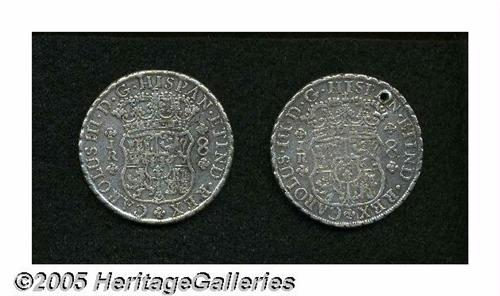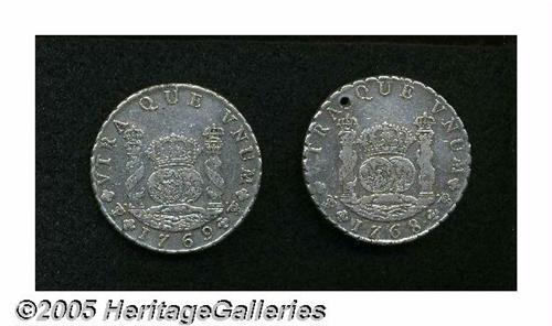 <B>Carlos III Pillar 8 Reales - Two Pieces, </B></I>KM50, 1768-JR, 4 petaled rosette, AVF, holed and lightly tooled surfaces, and 1769-JR, round over fancy 9 in 69, VF-XF, appears to be cleaned and probably ex-mount (top rim details abraded.) <B>Sold as i