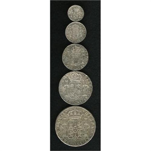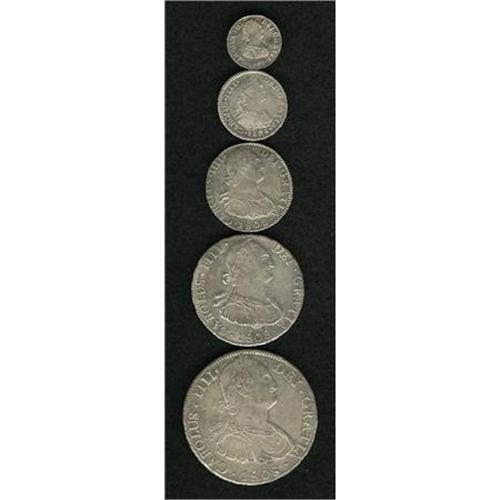 <B>Carlos IIII Silver Type Set 1808-PJ,</B></I> a choice set of the five denominations featuring: KM69 1/2 Real, choice UNC, KM70 Real, lustrous AU-UNC, KM71 2 Reales, lightly toned UNC, tiny scratch on the bust, KM72 4 Reales, nice lustrous UNC and KM73 8 Reales, nice UNC, fully lustrous and well-struck. An exceptionally attractive set struck in the final year of the reign of Carlos IIII.<BR><BR><b>Shipping:</b> Coins & Currency (<a target="_blank" href="http://www.heritageauctions.com/common/shipping.php">view shipping information</a>)