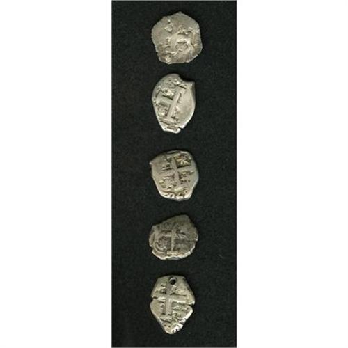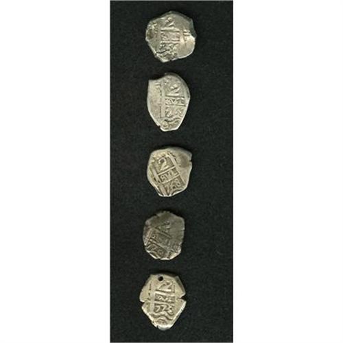 <B>Carlos III cob 2 Reales Date Run,</B></I> KM43, five different dates comprising: 1766, 1767, 1768, 1770 and 1773/0, scarce final date of the cob series. All the dates are very clear. The coins grade F-VF and are undamaged except for the 1773/0, which has a tiny hole at the top. <B>Sold as is, no return lot.</B></I><BR><BR><b>Shipping:</b> Coins & Currency (<a target="_blank" href="http://www.heritageauctions.com/common/shipping.php">view shipping information</a>)