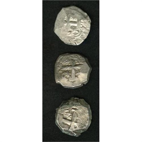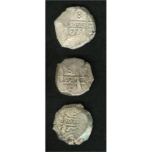 <B>Carlos III cob 8 Reales - Trio,</B></I> KM45, 1771(P-V-Y), acid washed VF, two bold dates but only portions of the mint and assayer letters, and 1772P-V-Y, two examples, both crude VF but fully original with clear dates and some mint and/or assayer initials visible. <B>Sold as is, no return lot.</B></I><BR><BR><b>Shipping:</b> Coins & Currency (<a target="_blank" href="http://www.heritageauctions.com/common/shipping.php">view shipping information</a>)