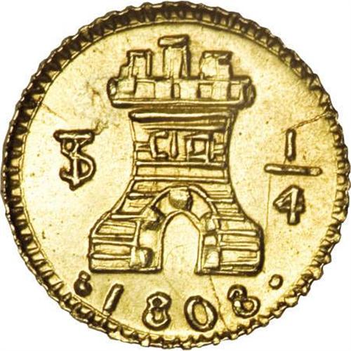 <B>Carlos IIII Fantasy gold 1/4 Escudo 1808-PTS,</B></I> gold striking similar to the 1/4 Real which has long been part of the lore of the colonial Potosi series. 0.68 grams. Choice AU-UNC. We sold a similar example from the Morris Geiger Collection for $805 in January, 2004.<BR><BR><b>Shipping:</b> Coins & Currency (<a target="_blank" href="http://www.heritageauctions.com/common/shipping.php">view shipping information</a>)