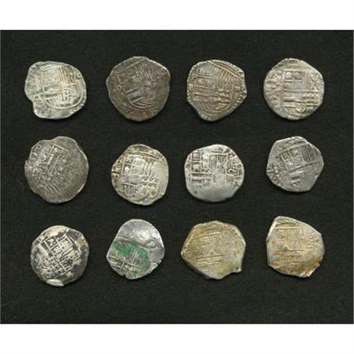 <B>Felipe II, III & IV cob 4 Reales Assortment,</B></I> twelve pieces, most with mintmark P visible and/or assayer's initial. We noted the following assayers: P, T, TR, C and B in a cursory glance at this lot. Grades are crude Fine to VF with one item holed & plugged, and none obviously sea salvaged. A very useful group of this scarce denomination. <B>Sold as is, no return lot.</B></I><BR><BR><b>Shipping:</b> Coins & Currency (<a target="_blank" href="http://www.heritageauctions.com/common/shipping.php">view shipping information</a>)