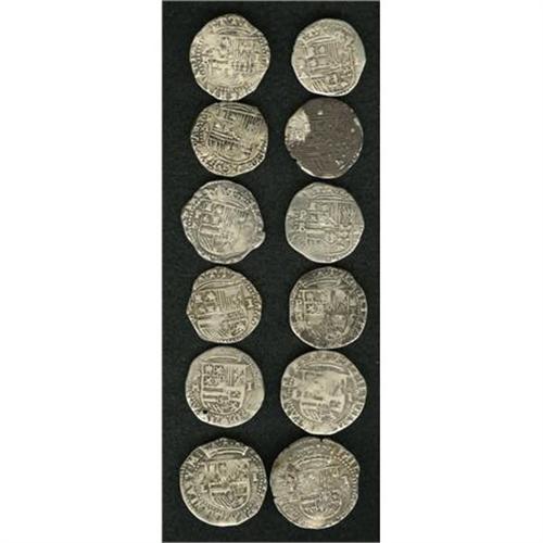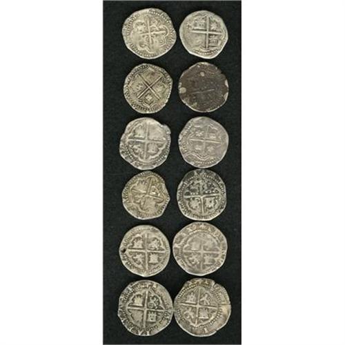 <B>Felipe II cob 1/4 Real - Various Assayers,</B></I> four examples as follows, all without letters on the lion side: Castle with P to the left and L to the right, nice AVF, holed; Castle with P to the left and uncertain letter to the right, possibly R or B, crude XF; and two examples with B to the left and P to the right, Fine and somewhat double-struck, and F-VF with two piercings. All are quite scarce and very collectible. <B>Sold as is, no return lot.</B></I><BR><BR><b>Shipping:</b> Coins & Currency (<a target="_blank" href="http://www.heritageauctions.com/common/shipping.php">view shipping information</a>)