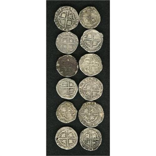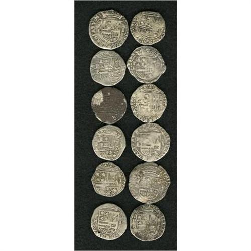 <B>Felipe II cob 1 Real Assortment,</B></I> twelve examples, all with P mintmark to the left of the shield and with assayer's initial below: Assayer A (3), Assayer M (2), Assayer B (4) and Assayer L (3). Conditions are generally F-VF, with one example holed and one with dark patination. <B>Sold as is, no return lot.</B></I><BR><BR><b>Shipping:</b> Coins & Currency (<a target="_blank" href="http://www.heritageauctions.com/common/shipping.php">view shipping information</a>)