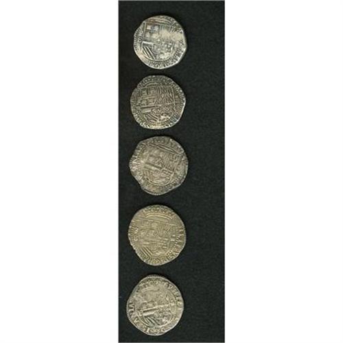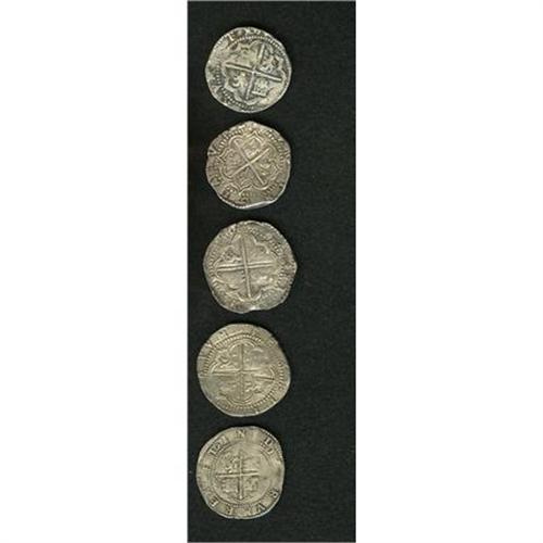 <B>Felipe II cob 4 Reales - Assayer B,</B></I> five selected examples, all with P over B to the left of the shield. The quality for this quintet is well above normal both for eye appeal and actual grade. All five pieces are toned VF. <B>Sold as is, no return lot.</B></I><BR><BR><b>Shipping:</b> Coins & Currency (<a target="_blank" href="http://www.heritageauctions.com/common/shipping.php">view shipping information</a>)