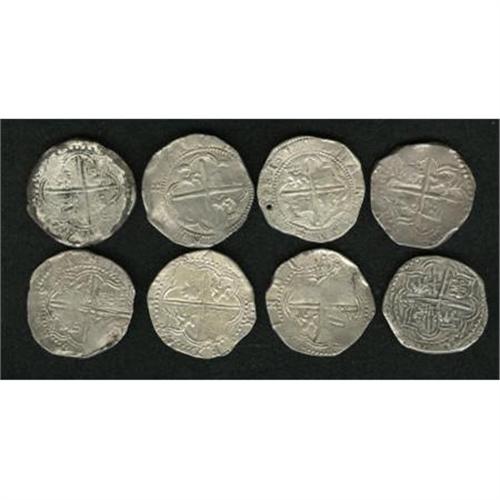 <B>Felipe II cob 4 Reales - Assayer B,</B></I> eight examples, most with mintmark P and/or assayer B, some with doubling, grades vary from crude Fine to VF and one piece is holed. <B>Sold as is, no return lot.</B></I><BR><BR><b>Shipping:</b> Coins & Currency (<a target="_blank" href="http://www.heritageauctions.com/common/shipping.php">view shipping information</a>)