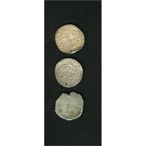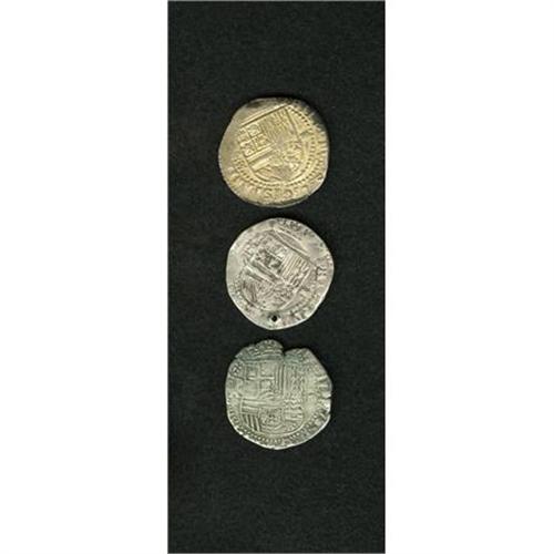 <B>Felipe II cob 4 Reales - Assayer R,</B></I> three examples of this scarce assayer, all with clear P mintmark above. Grades are: F-VF, holed, P punched over another letter; F-VF, slightly double-struck; and choice nearly XF with superficial patination along the edge. <B>Sold as is, no return lot.</B></I><BR><BR><b>Shipping:</b> Coins & Currency (<a target="_blank" href="http://www.heritageauctions.com/common/shipping.php">view shipping information</a>)
